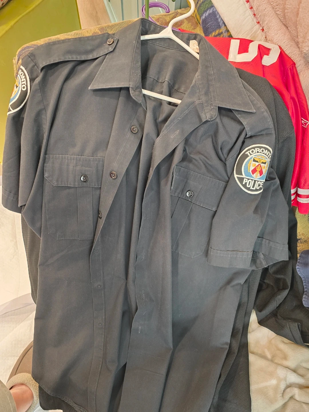 This is a Toronto Police short sleeve uniform shirt. It's made of a 65% polyester and 35% cotton blend. These shirts are durable and comfortable for wear.