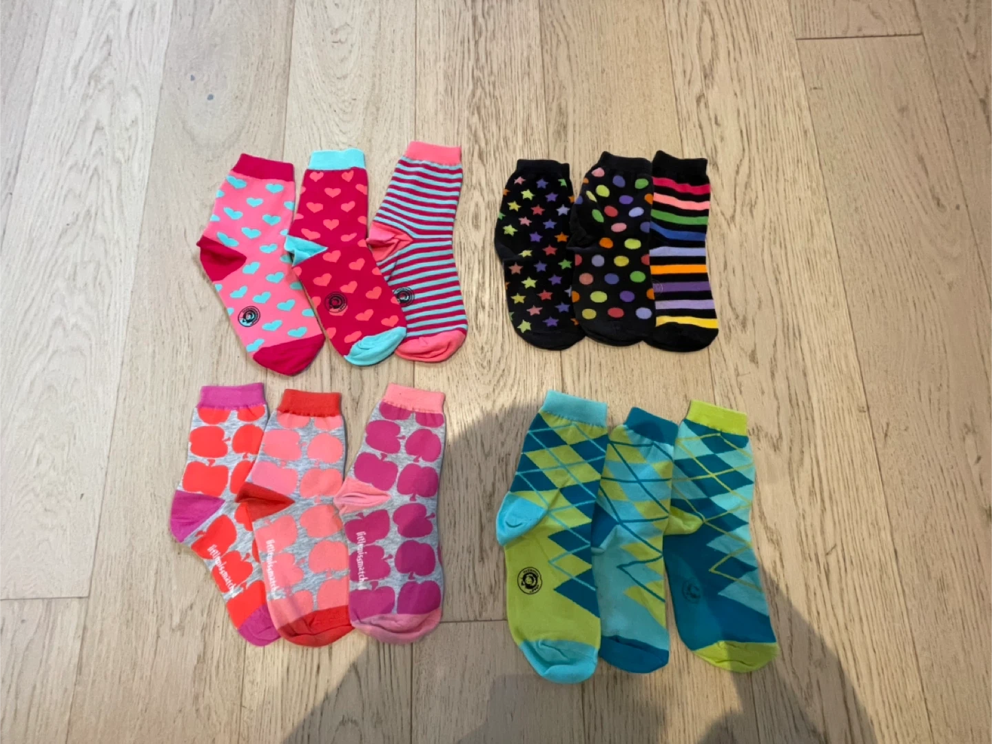 Four sets of 3 of colourful socks from Little Missmatched. Intended to mix and match. Includes hearts, stripes, stars, polka dots, apples, and argyle patterns. Made with a comfortable blend. Adds a fun touch to any outfit!