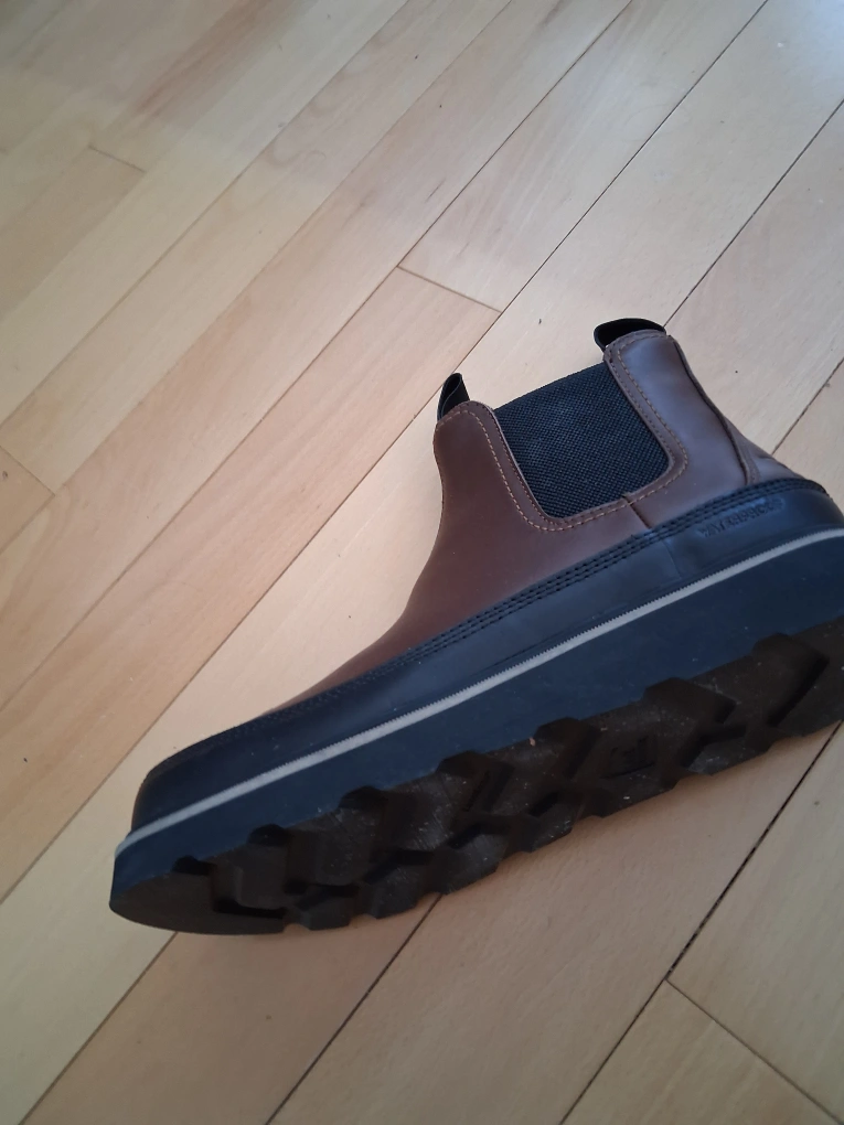 These Sorel Chelsea boots are made with brown leather. They have elastic side panels and a durable sole. Perfect for everyday wear!