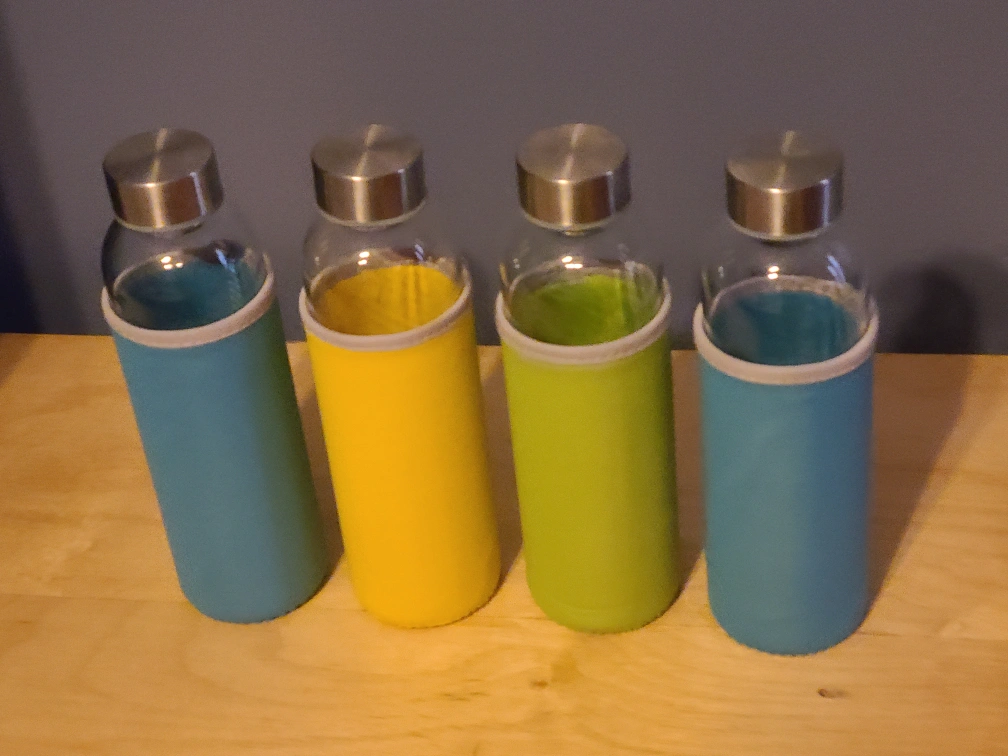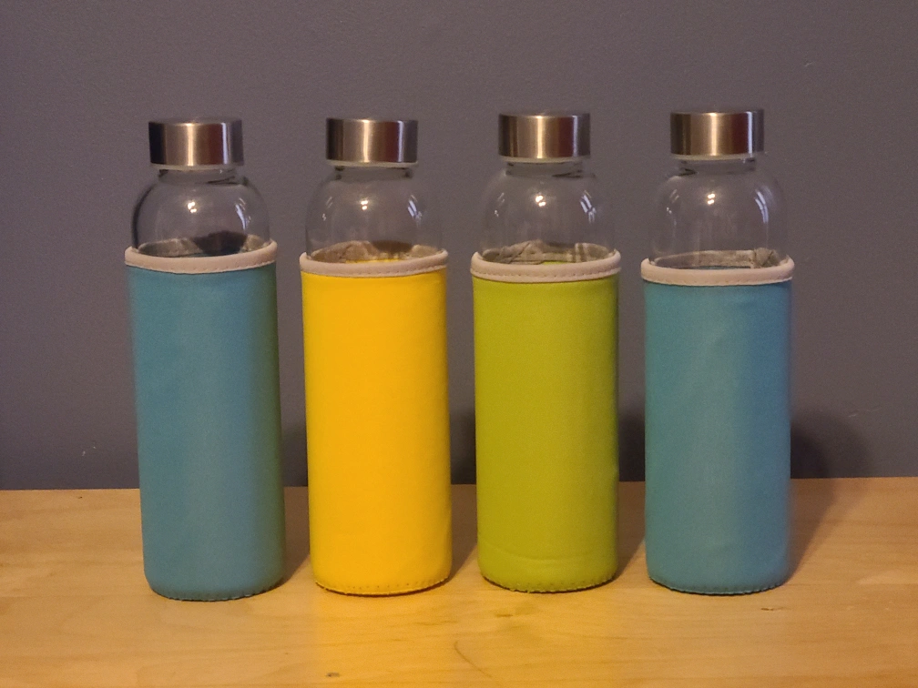 This set includes four glass juice bottles, each with a protective sleeve. Sleeves come in blue, yellow, and green colors. They're perfect for staying hydrated on the go!