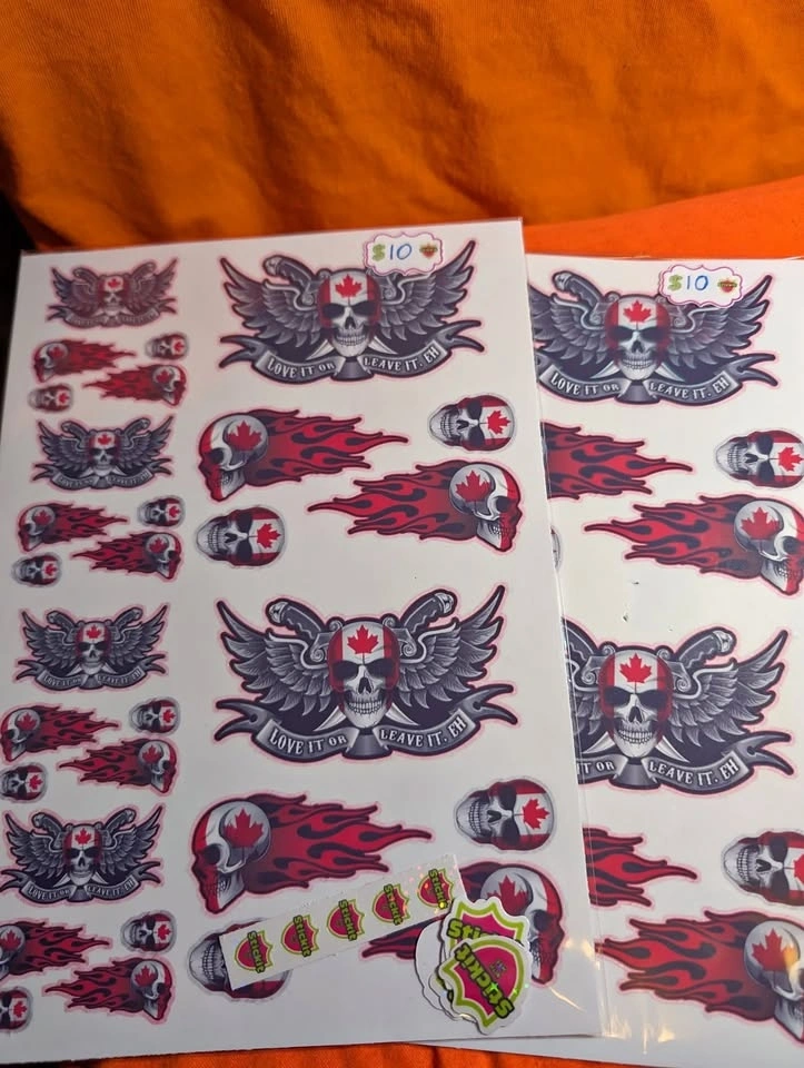 Show your Canadian pride with an edge! This value-packed sticker sheet features multiple bold, high-detail skull graphics integrated with the iconic red and white Canadian flag motif. It's the perfect way to customize all your gear, from vehicles to everyday items.