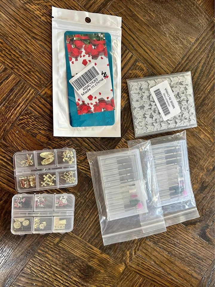 All new nail art bundle. Includes nail drill bits, stamping plate, 3D butterfly decorations, and multiple charm sets. Everything is brand new and unused. $40 for the full bundle.