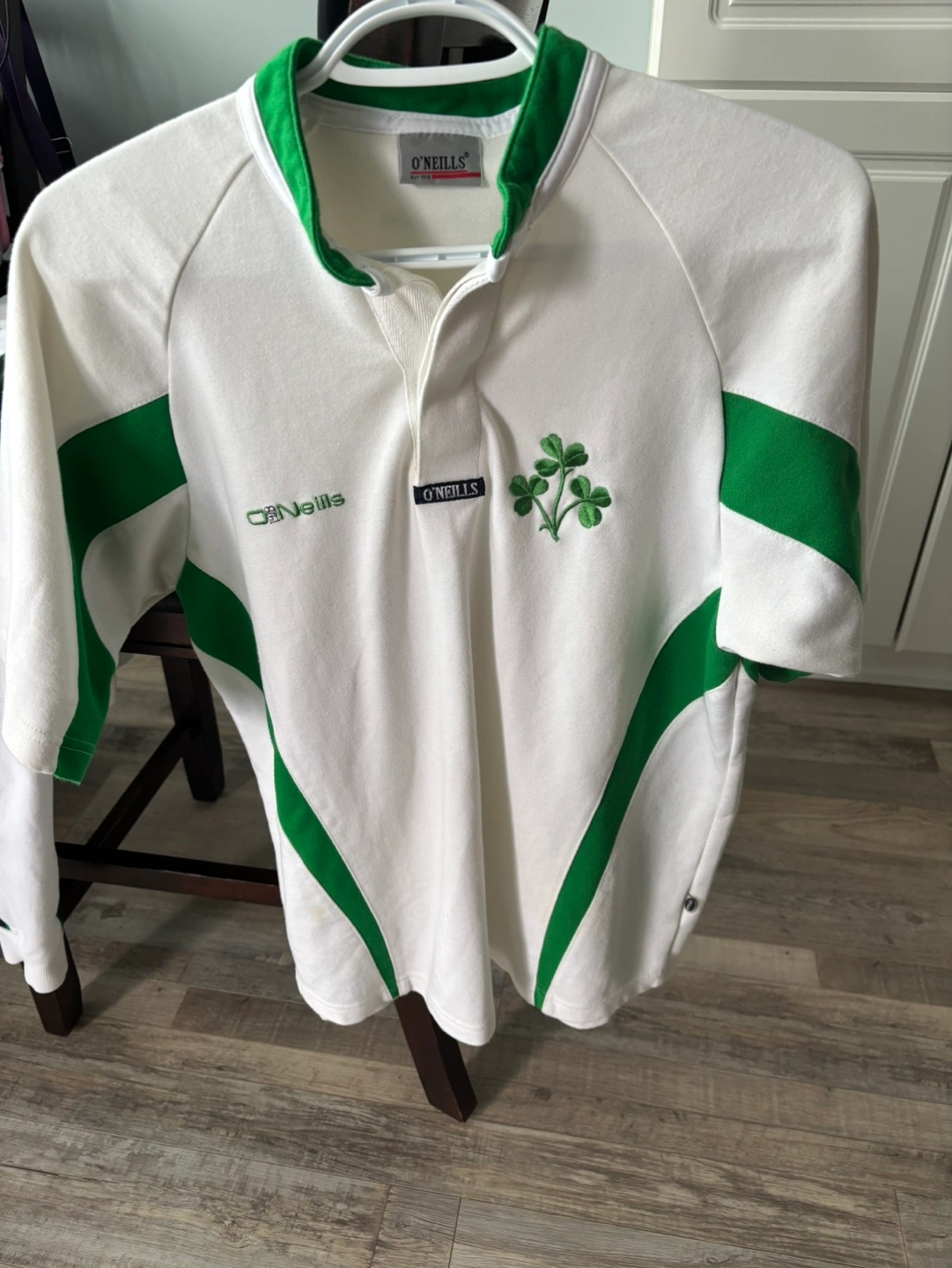 Ireland 🇮🇪 Short sleeved rugby jersey, white with green accents. Features a shamrock logo on the chest and the O'Neills logo on the sleeve. Never worn, collectables,