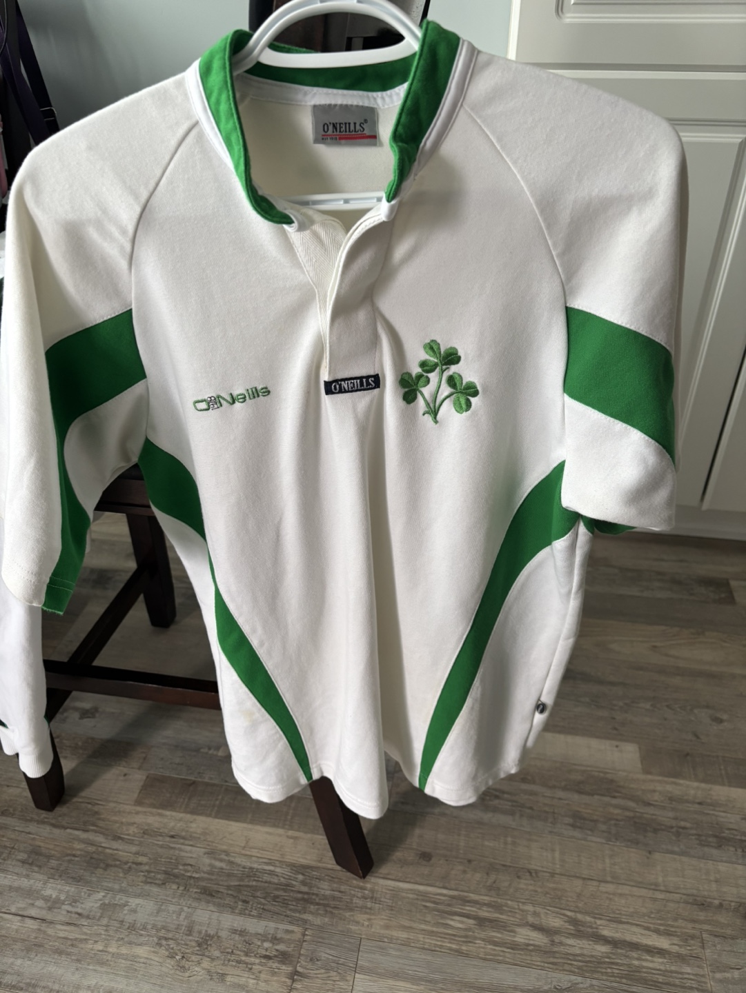 Ireland 🇮🇪 Short sleeved rugby jersey, white with green accents. Features a shamrock logo on the chest and the O'Neills logo on the sleeve. Never worn, collectables,