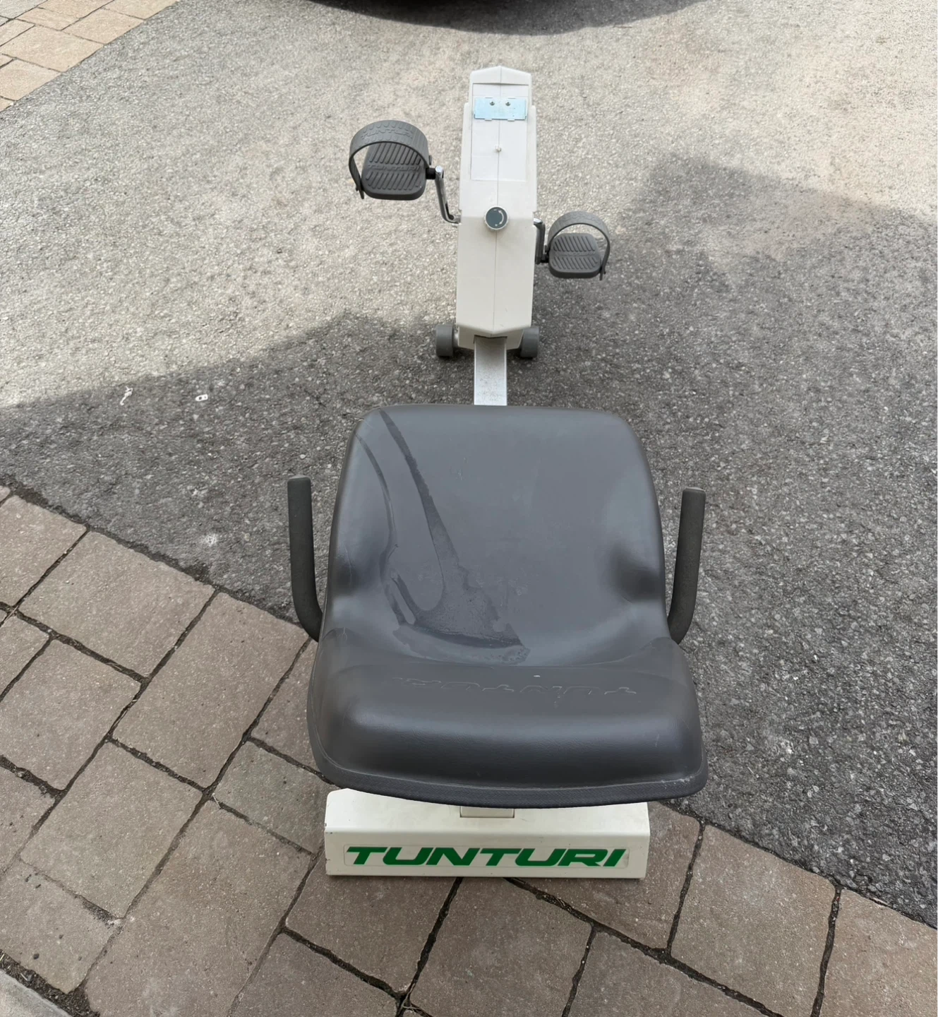A Tunturi 504 recumbent exercise bike with a comfortable seat. It features adjustable pedals for your workout. This bike's design makes it easy to get on and off!