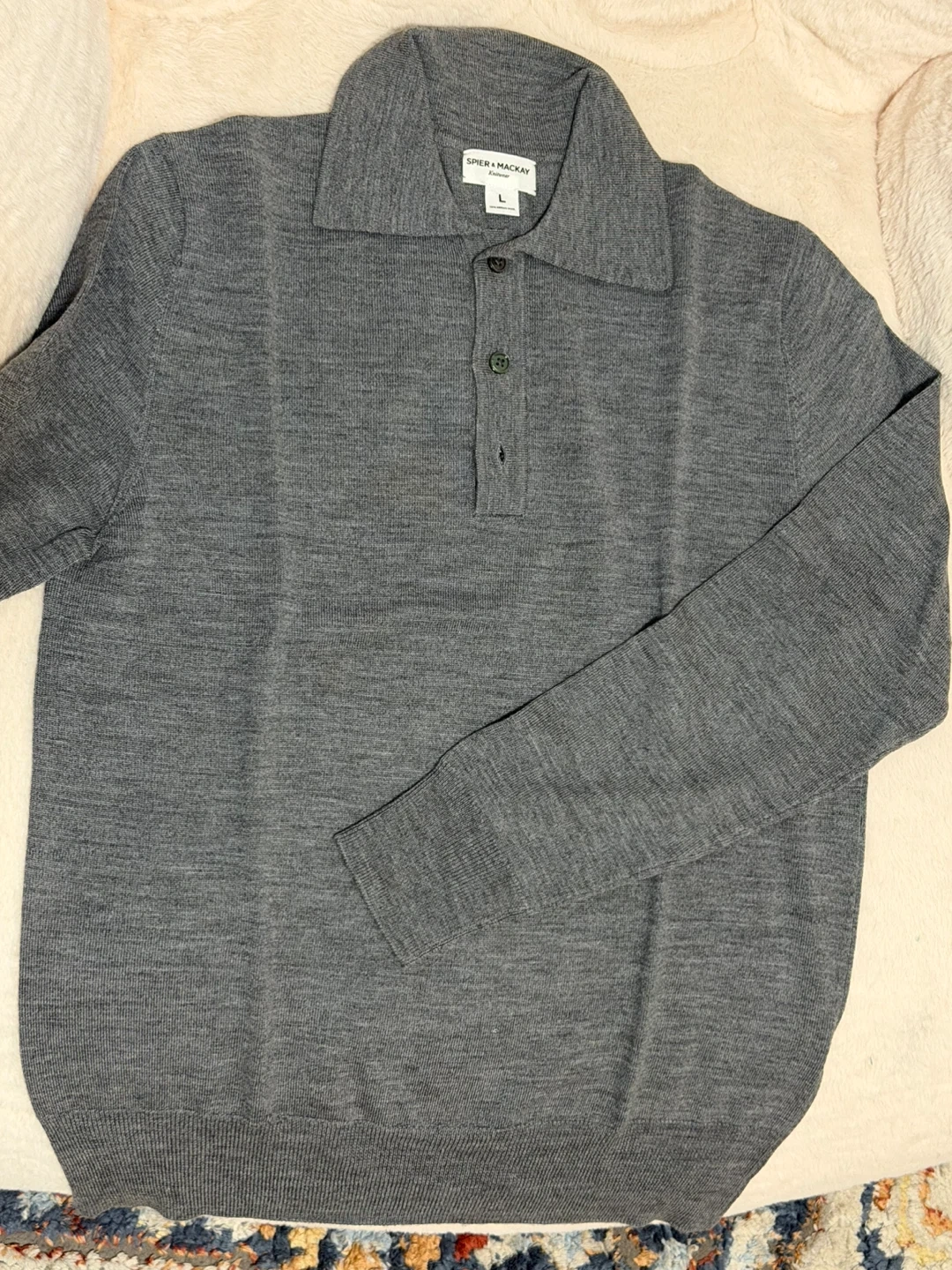 Spier & Mackay knitwear sweater. It's a size large, made with 100% merino wool. This sweater has a button collar design. It's great for layering during cooler weather!