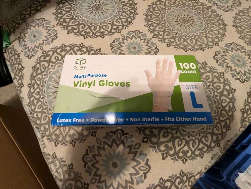 I have a box of Comfy Package Multi-Purpose Vinyl Gloves in size Large. These are high-quality, clear, powder-free gloves perfect for everything from household cleaning and painting to food prep or pet care.