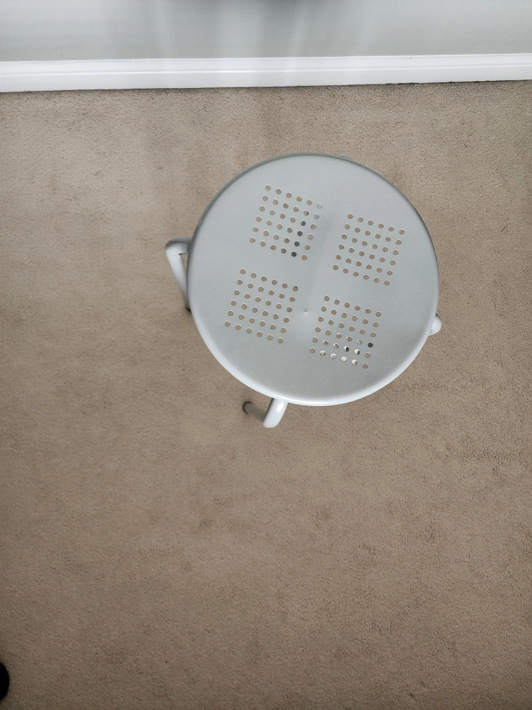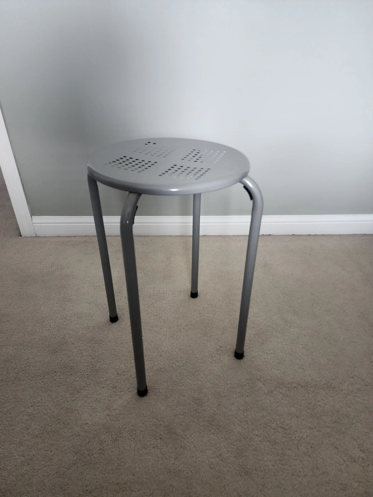 Small grey metal stool. Perforated seat. Three legs. Compact and lightweight. Ideal for extra seating or a side table.