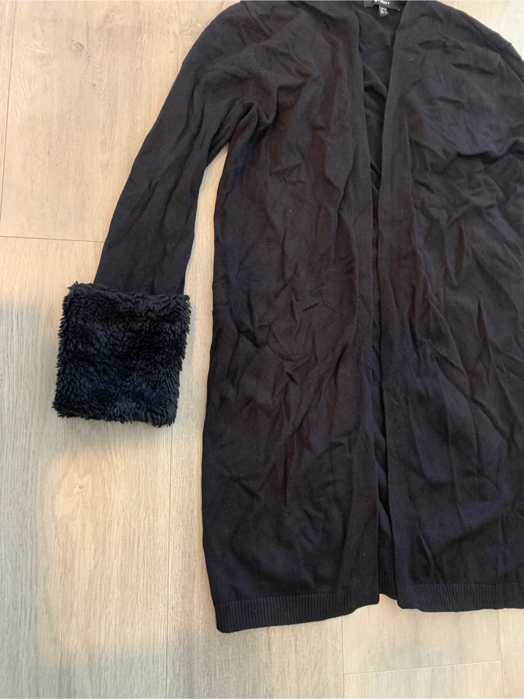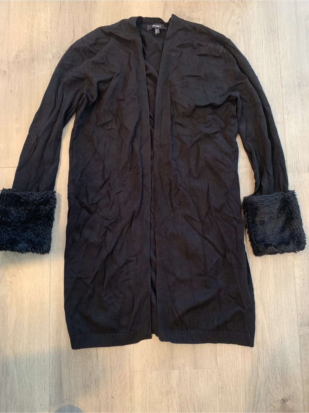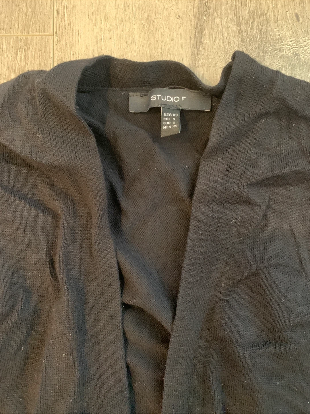 This is a black STUDIO F cardigan. It features contrasting fuzzy cuffs. Size is XS. Also included another black shirt. pick up only.