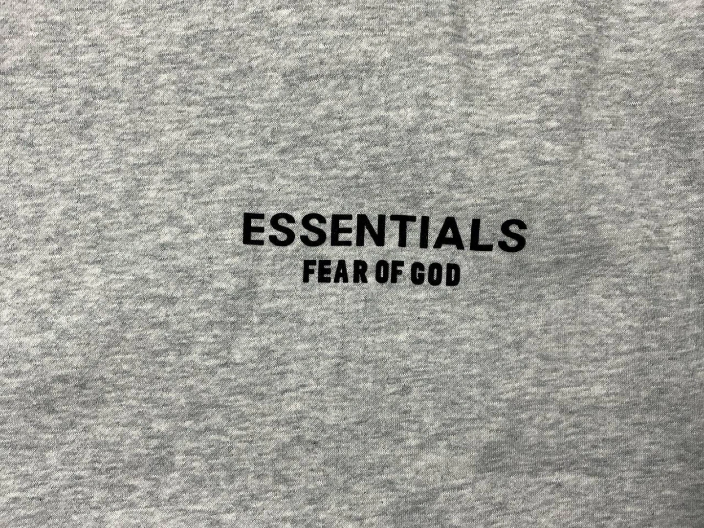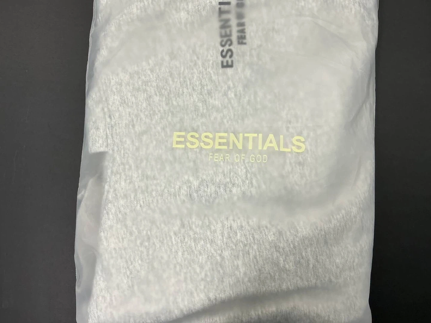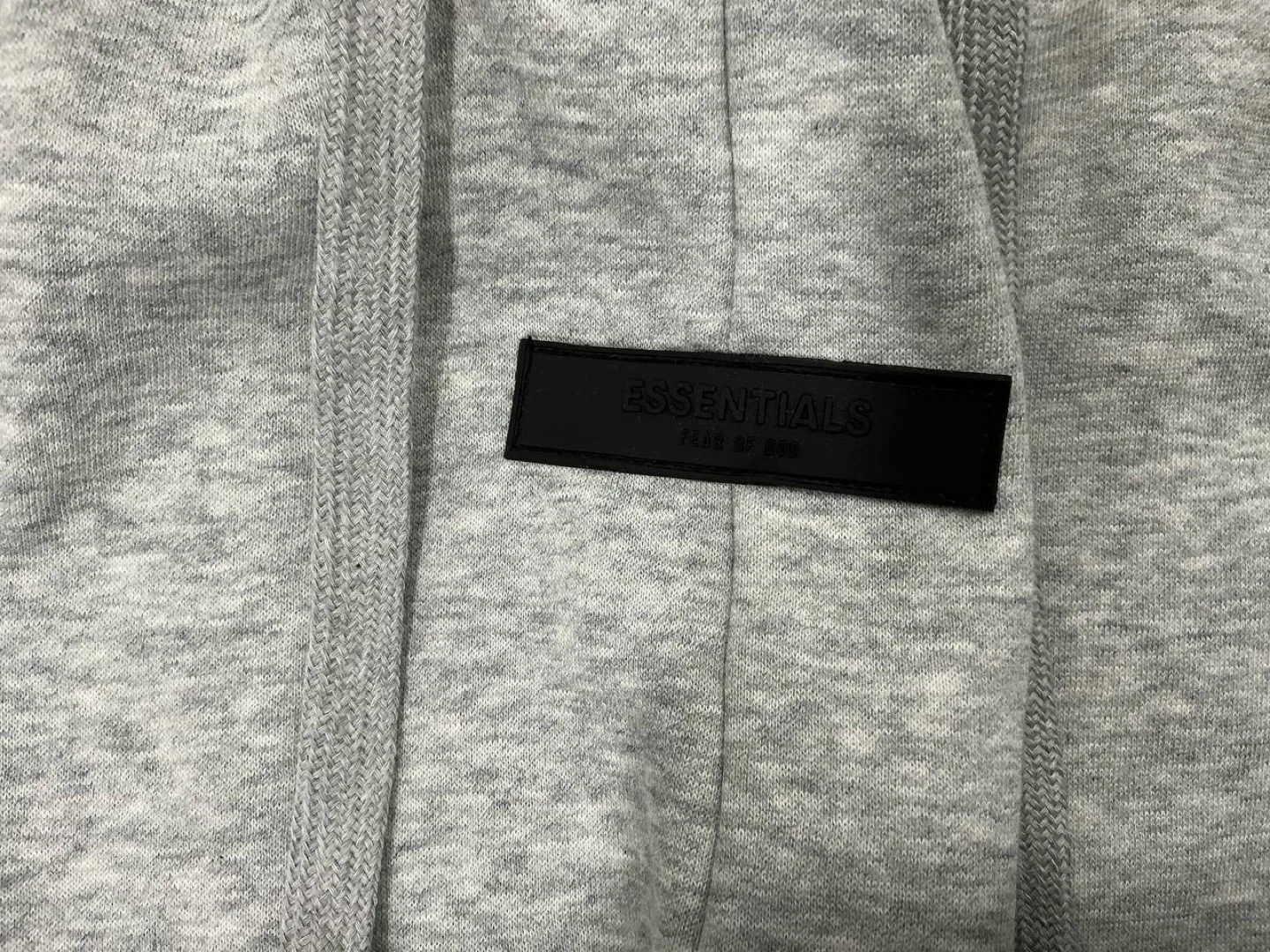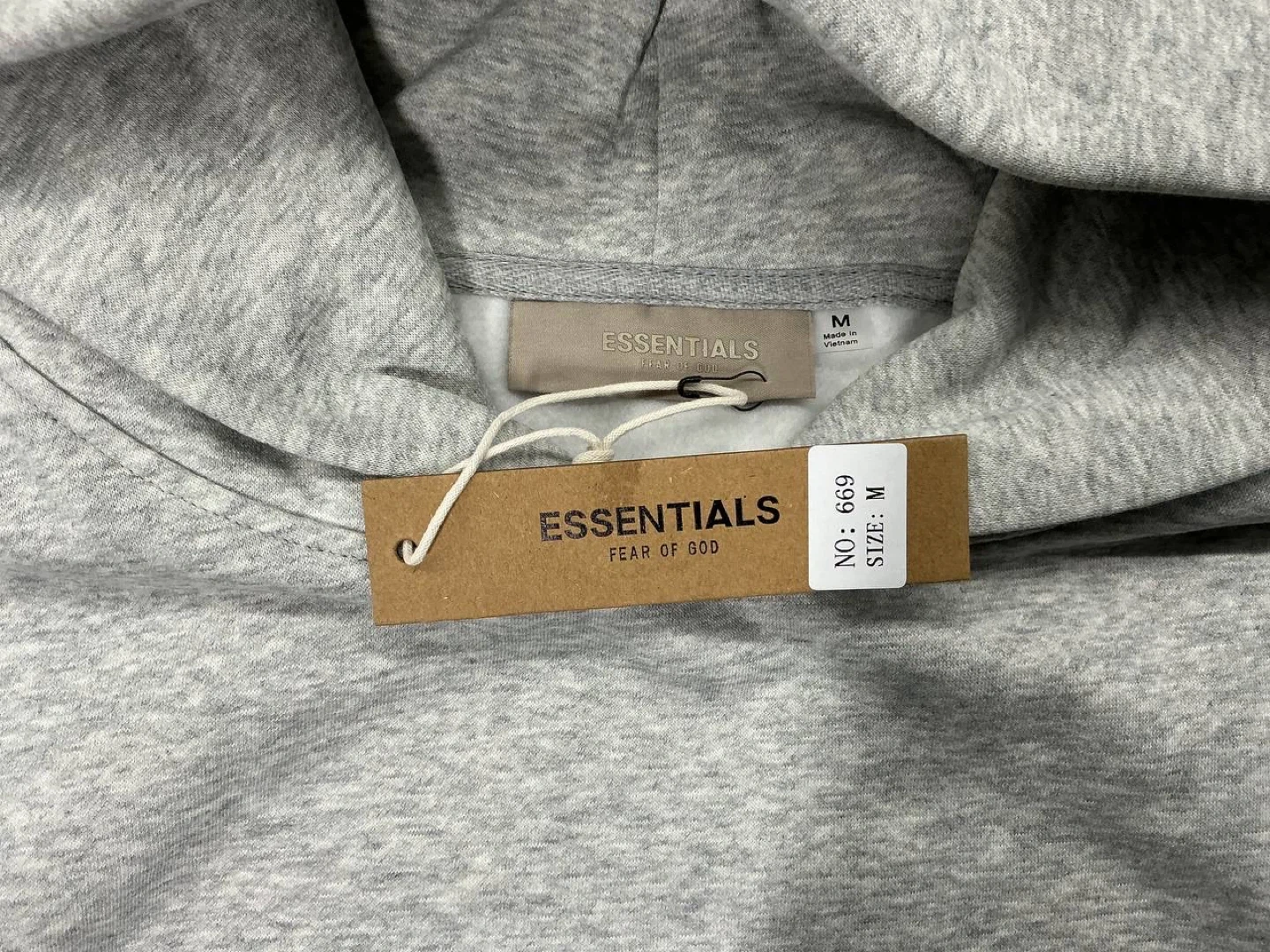 ESSENTIALS Fear of God hoodie in light grey. It's a size medium and made from a fleece-lined material. This comfy hoodie is great for everyday wear.