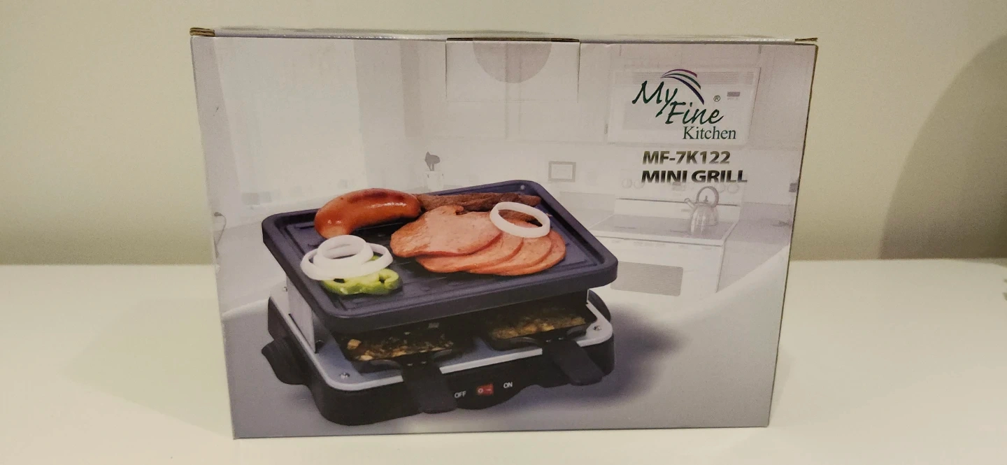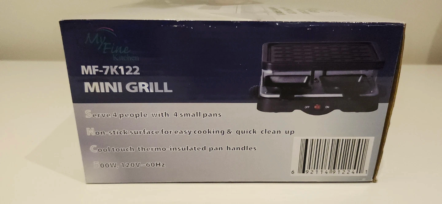 This My Fine Kitchen mini grill serves 4 people with 4 small pans. It has a non-stick surface for easy cooking and quick clean up. The cool touch handles offer thermo insulation. It's 800W, 120V~60Hz.