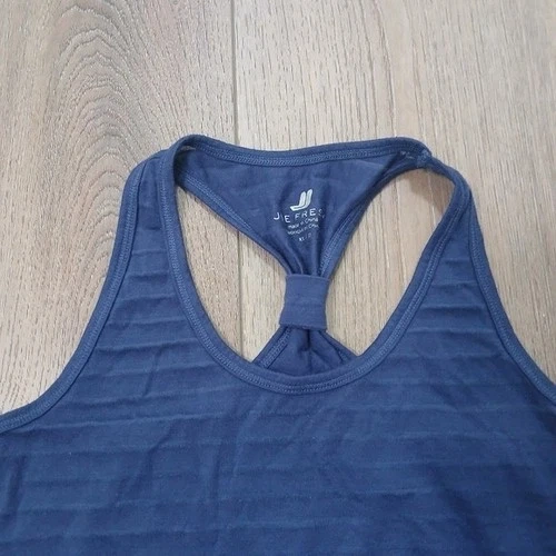 Joe Fresh Athletic Racerback Tank. Size XS. Length: 22". Dark blue and purple. Racerback with gathered strap detail. Adjustable drawstring hem. Lightweight breathable fabric. Great pre-owned condition. No holes or stains noted. Perfect for gym workouts, layering, yoga, or casual athleisure wear.