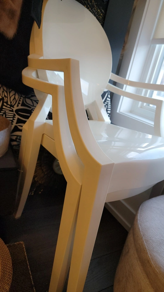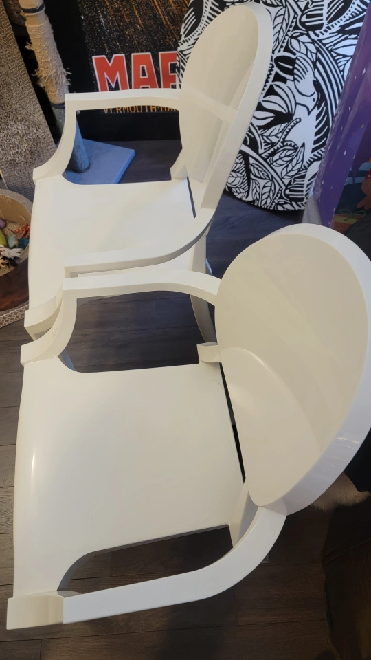 Gorgeous pair of two white ghost chairs. Modern design. Armrests and curved back. Very comfortable & they are stackable for easy storage. Good for dining room or event space/bedroom/boutique/photography studio/prop chair etc