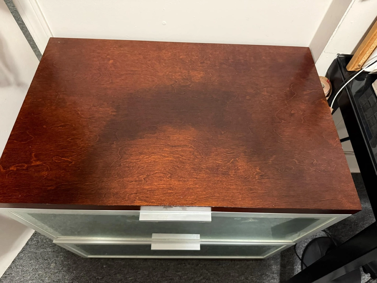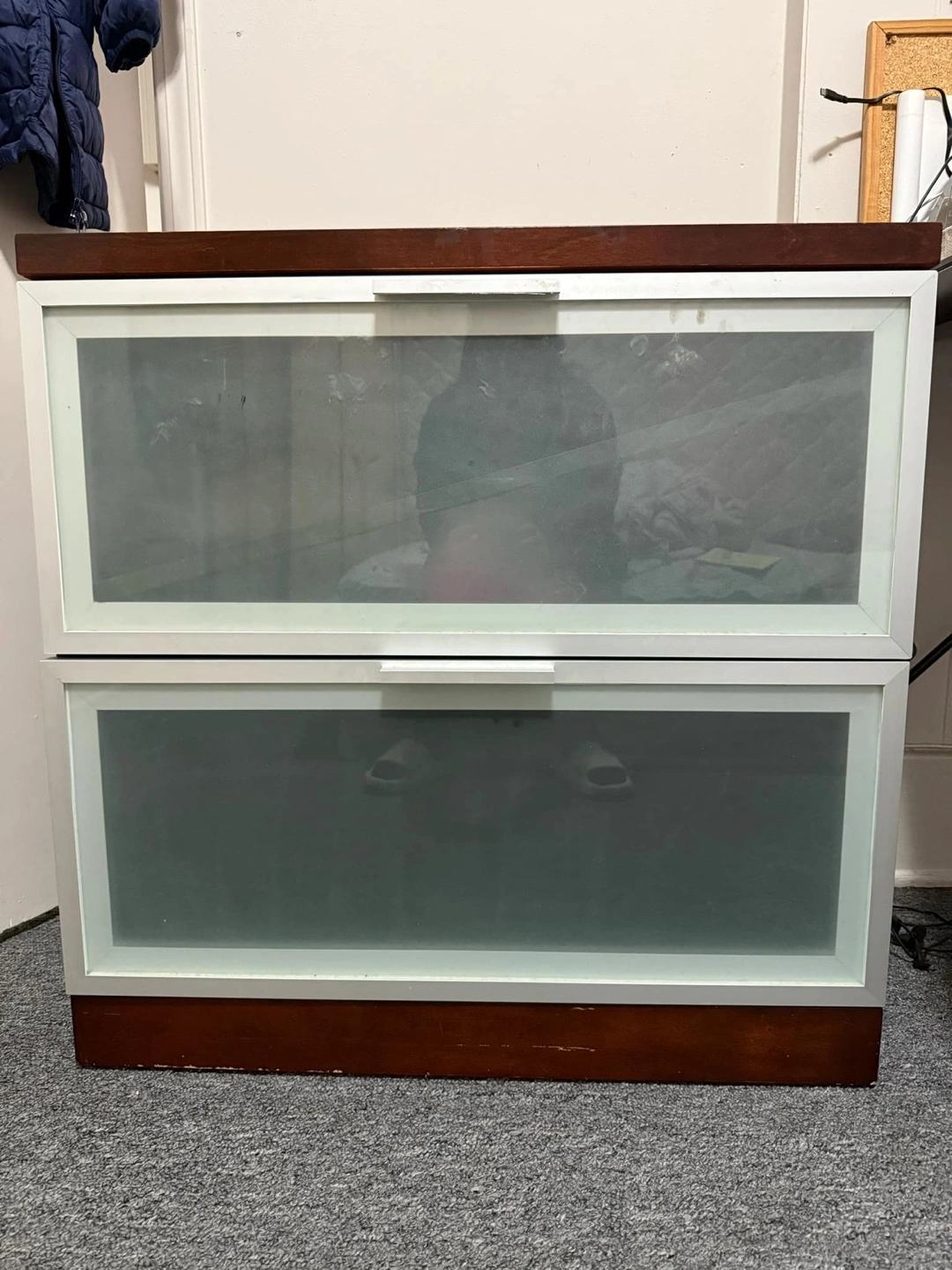 Modern nightstand. Two drawers with frosted glass fronts. Dark brown wood top and silver coloured frame. Some minor wear.