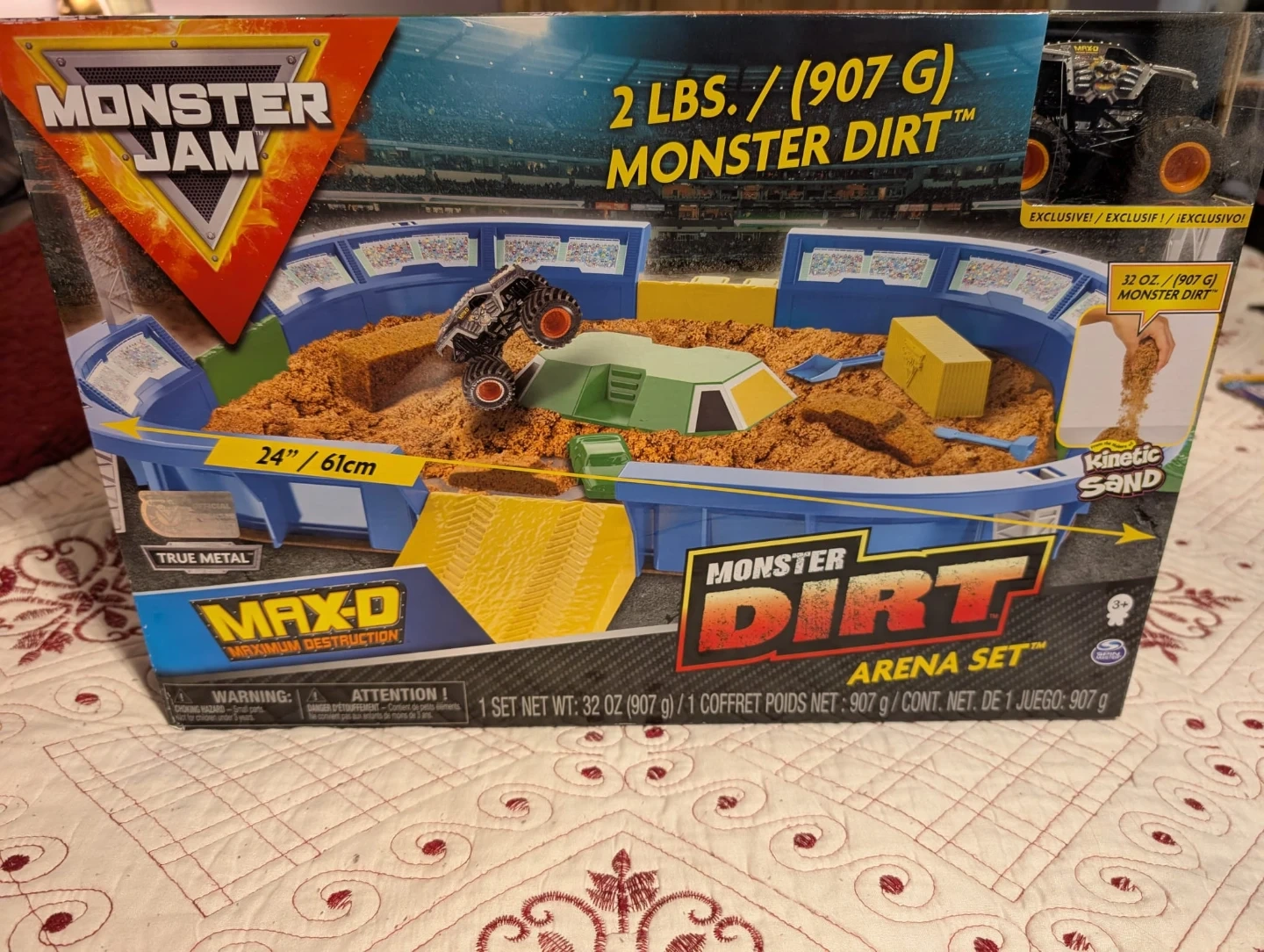 Monster Jam Monster Dirt Arena Set with 2 lbs (907g) of Monster Dirt and Kinetic Sand! The arena is 24" / 61cm. It also includes a Max-D Maximum Destruction truck