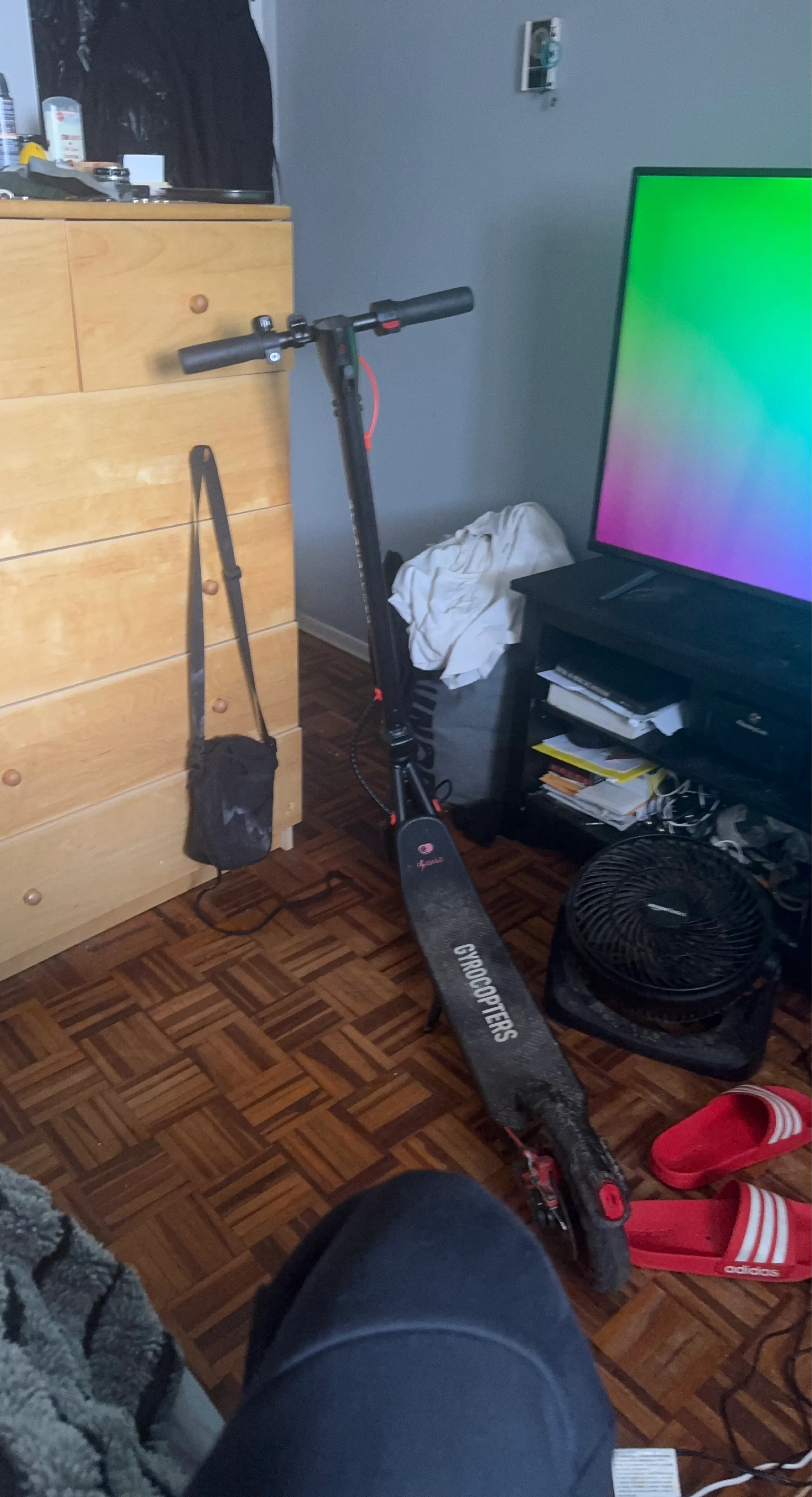 This is a black GYROCOPTERS electric scooter. It's a fun way to get around town. Simple to operate and easy to store when not in use.