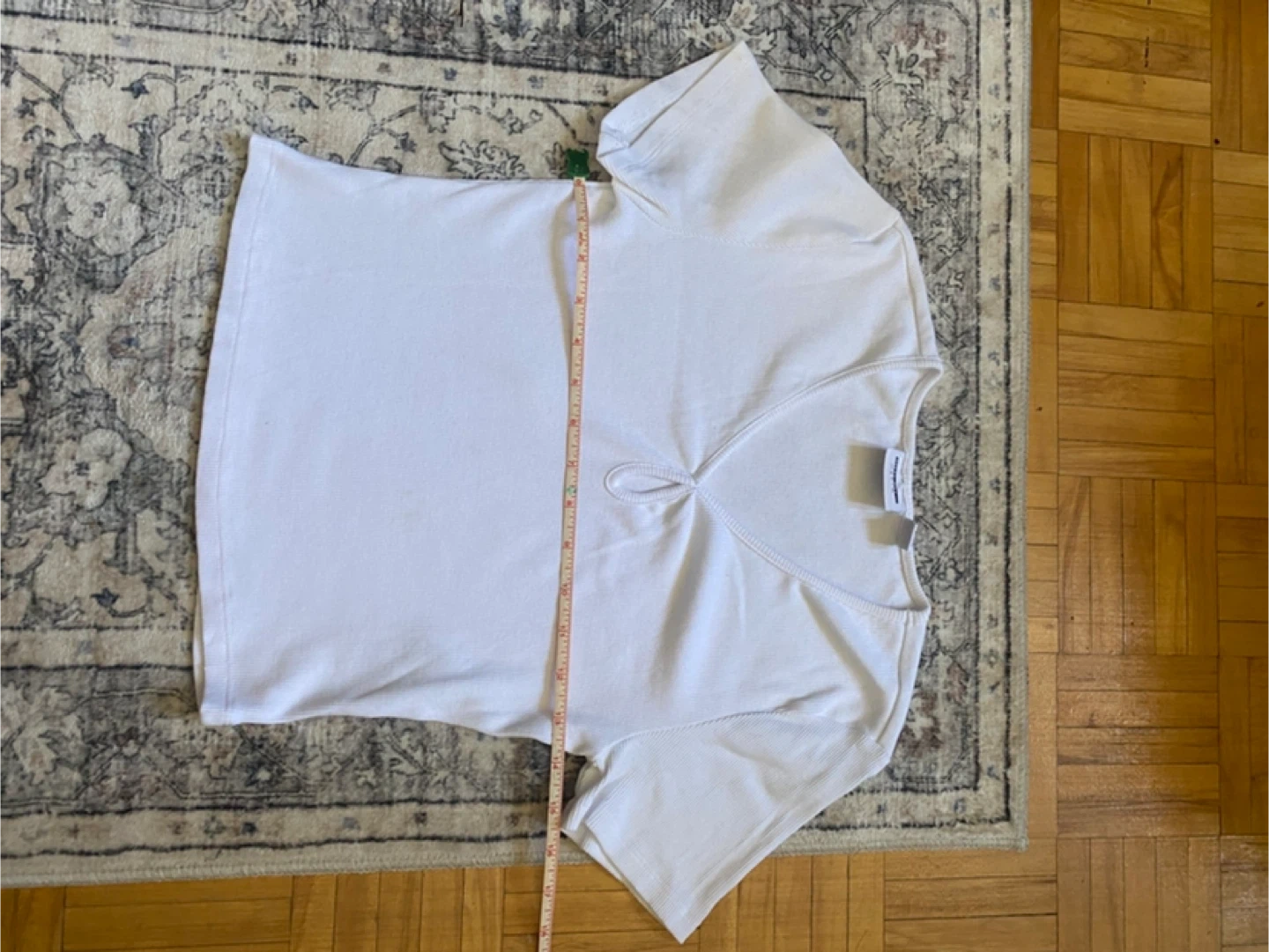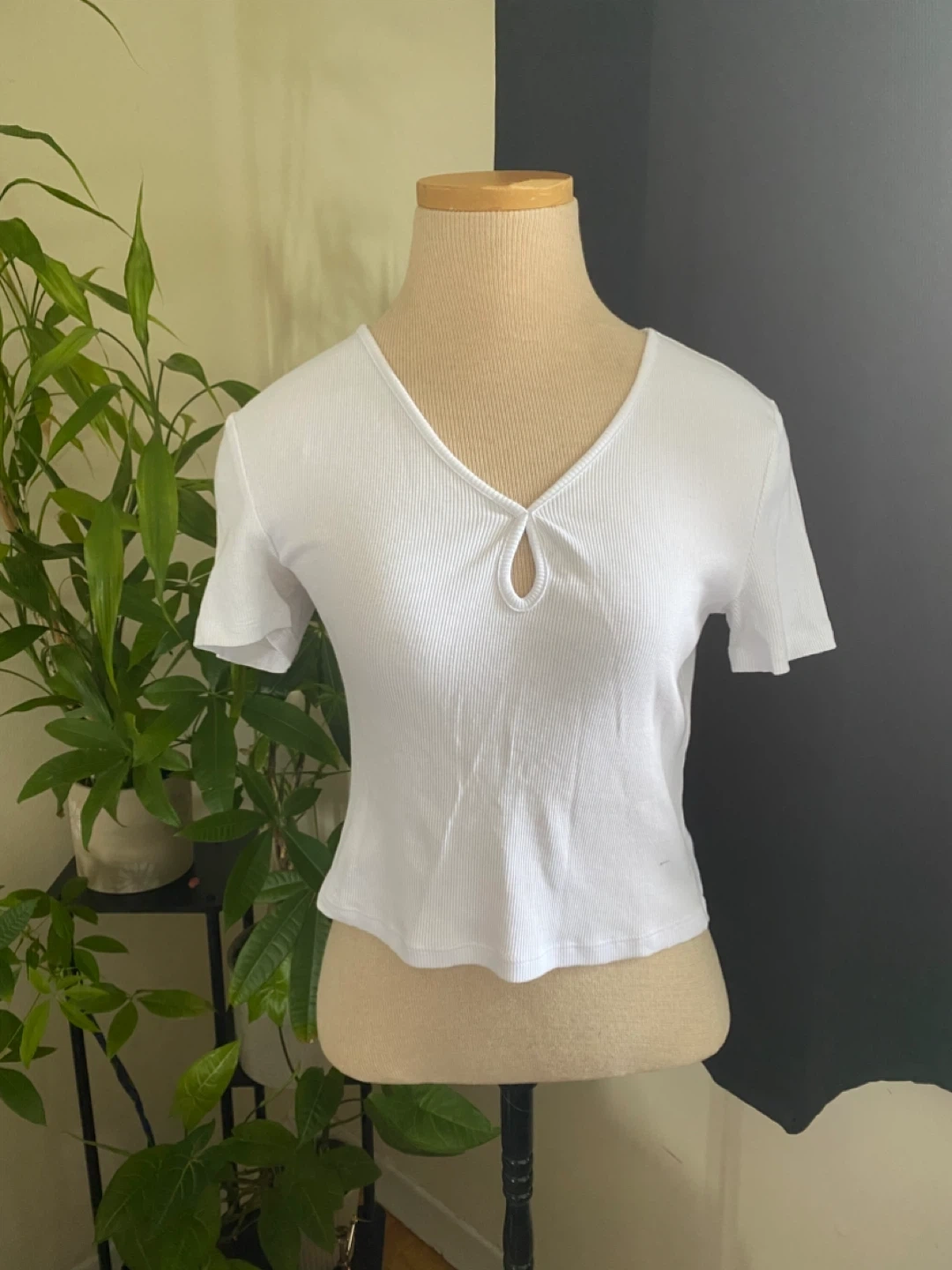 A white ribbed t-shirt with a unique keyhole neckline. It's made from a comfortable cotton blend. This top is great for layering or wearing on its own.