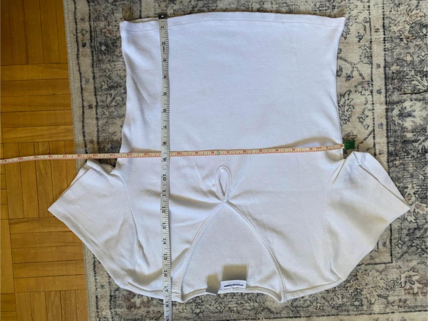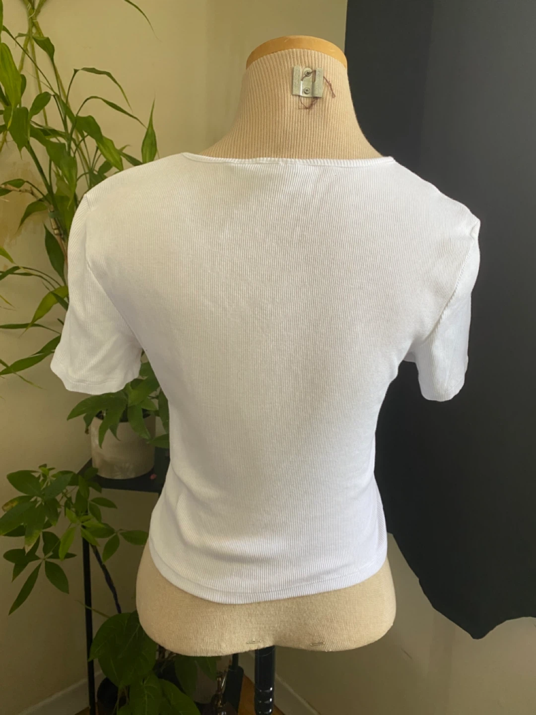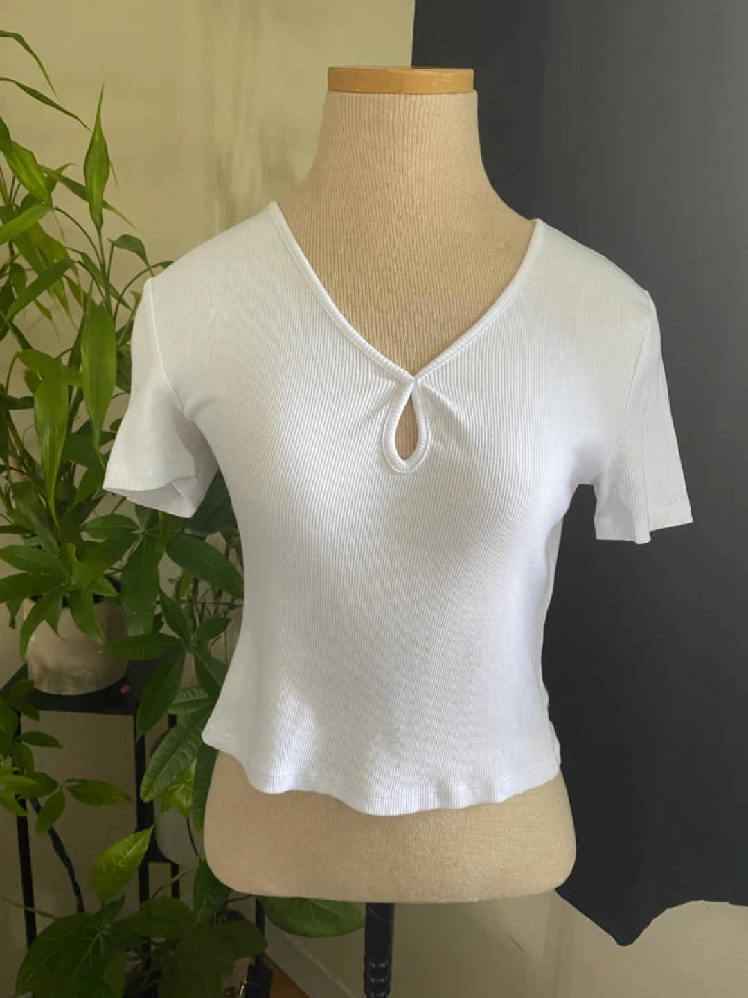 A white ribbed t-shirt with a unique keyhole neckline. It's made from a comfortable cotton blend. This top is great for layering or wearing on its own.