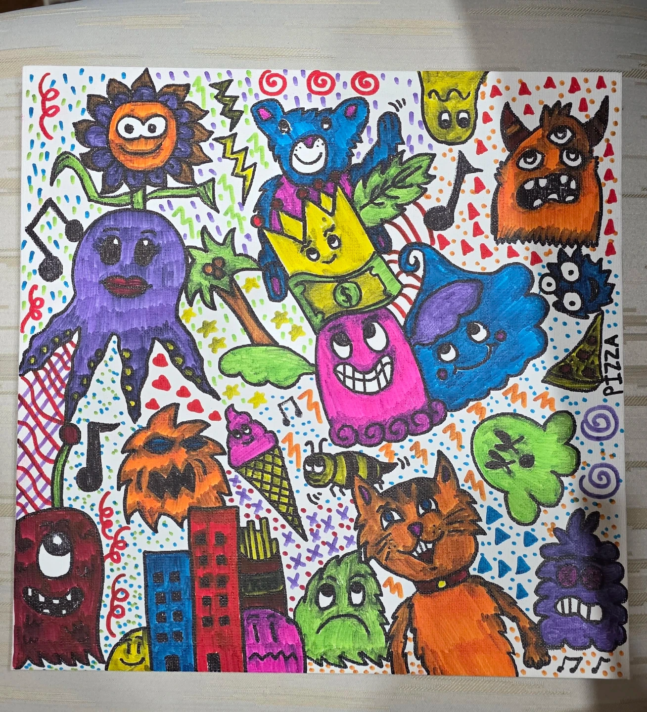 Vibrant canvas art featuring a playful mix of colourful monsters, doodled elements, and cityscapes. This piece adds a fun, energetic touch to any space. Hand-drawn artwork on canvas. Size: 12x12" 30.48cmx30.48cm