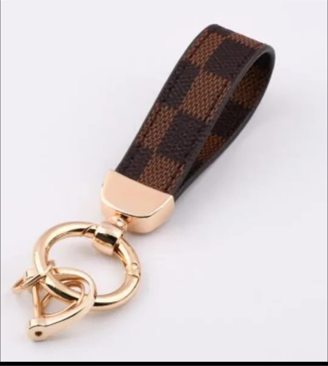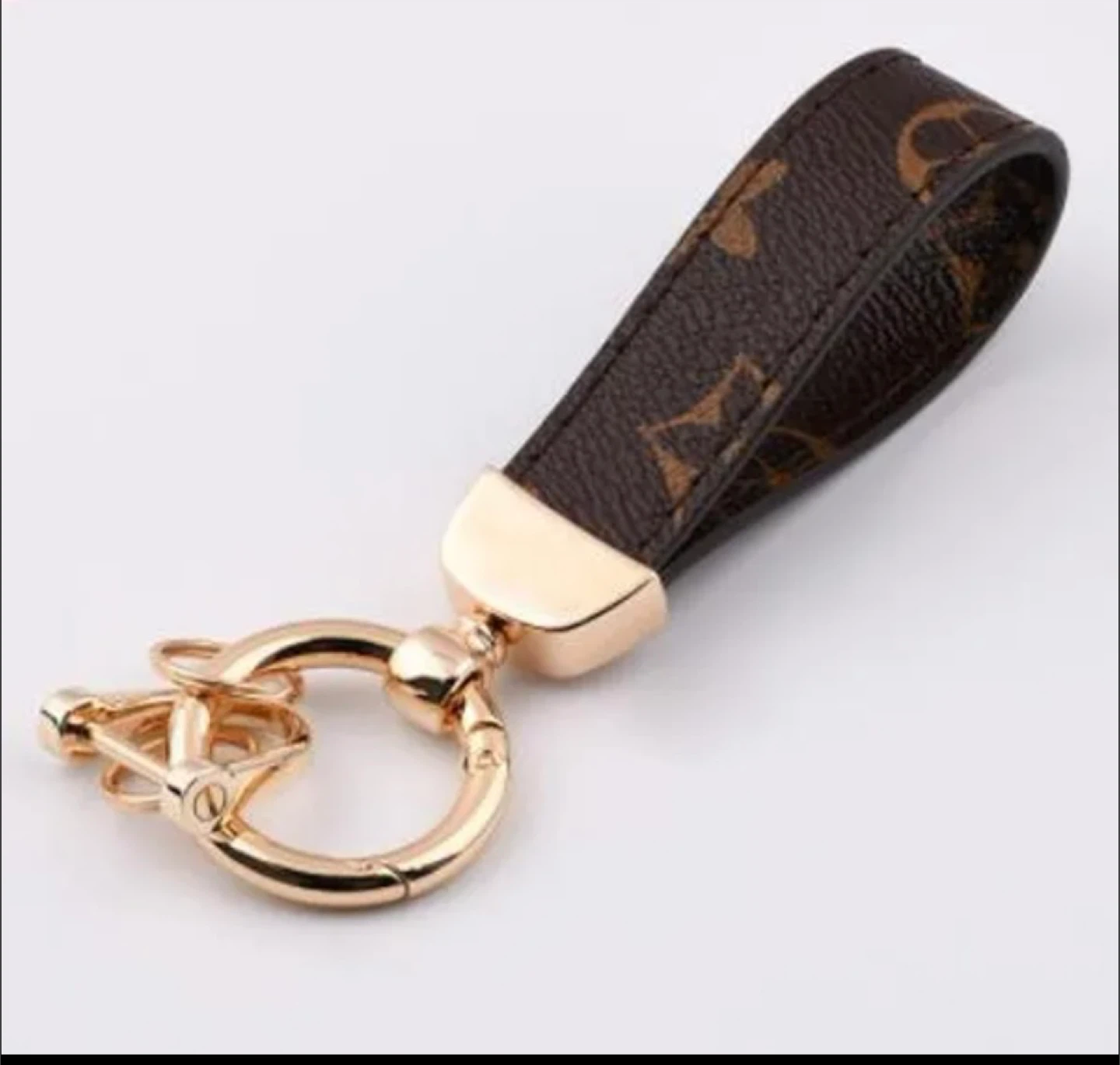 Selling a Louis Vuitton key chain. It's in great condition and ready to add a touch of luxury to your keys or bag! The design features the iconic LV pattern on a brown strap with gold-tone hardware. Leather