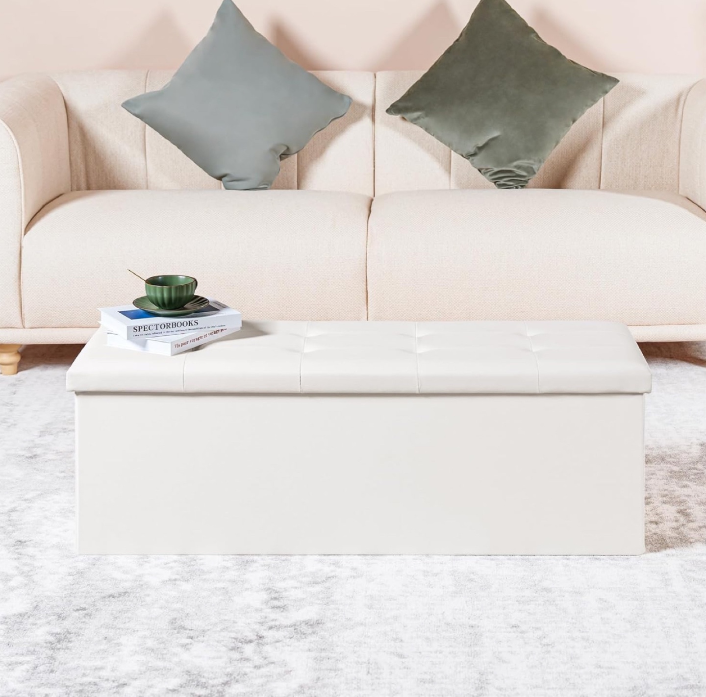 Large storage ottoman, upholstered in white PU leather. Features button tufting and a hinged lid for easy access to compartments. Perfect for storing blankets, pillows, or other items. Easy to assemble.