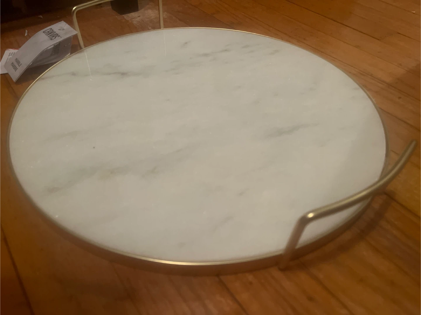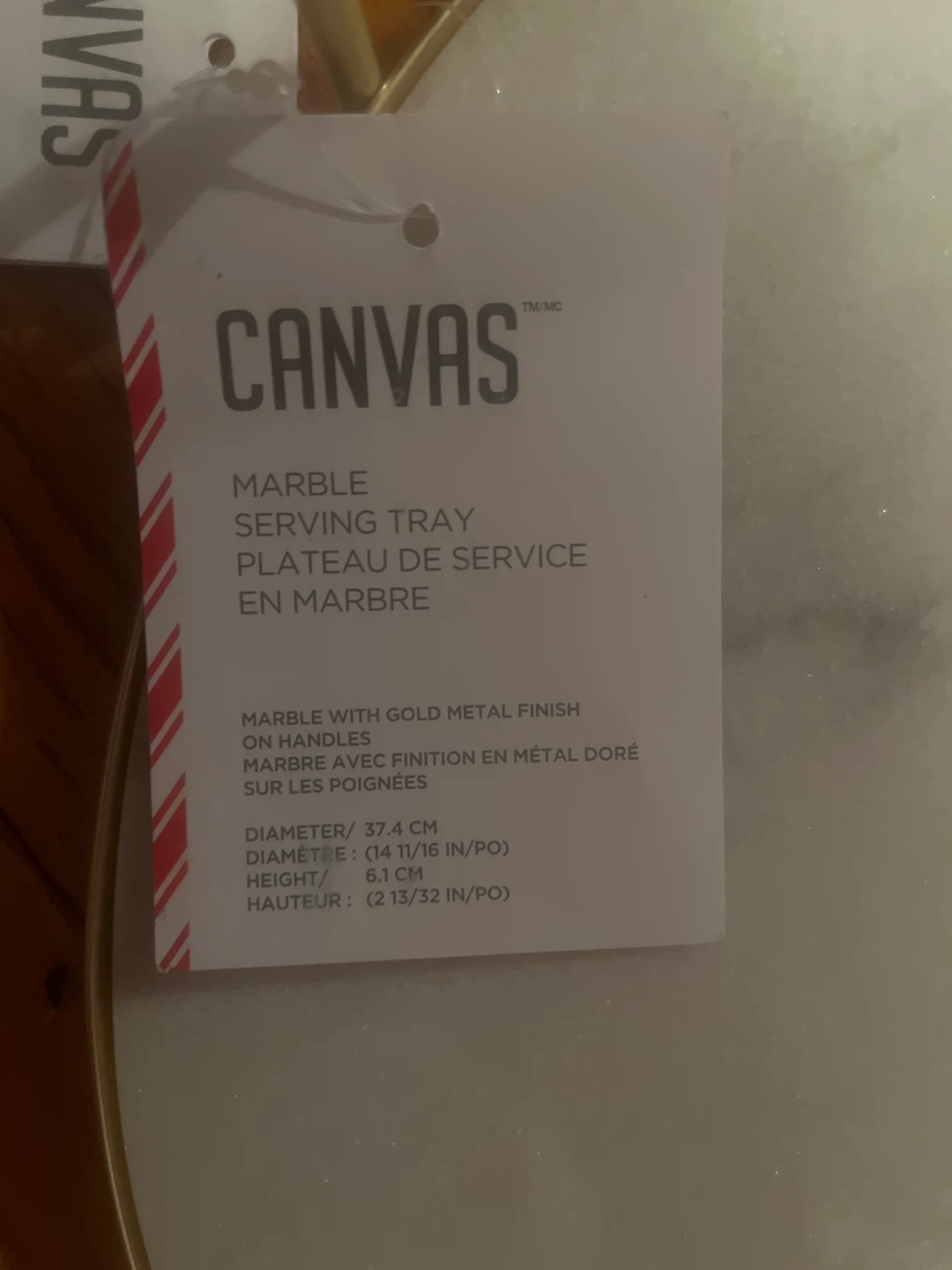 Selling a beautiful Canvas marble serving tray! It has a gold metal finish and handles, making it easy to carry. The diameter is 37.4 cm and the height is 6.1 cm. It's perfect for serving snacks or displaying items in your home