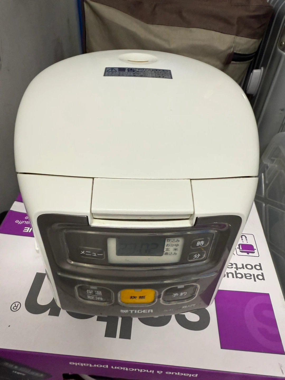 Tiger JAI-R1 rice cooker with a capacity for 0.5 to 1.5 cups of rice. Inner pot includes markings for various rice types. It features a digital display and multiple cooking functions. Comes with the power cord.