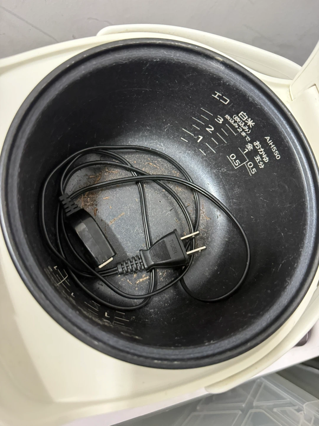 Tiger JAI-R1 rice cooker with a capacity for 0.5 to 1.5 cups of rice. Inner pot includes markings for various rice types. It features a digital display and multiple cooking functions. Comes with the power cord.