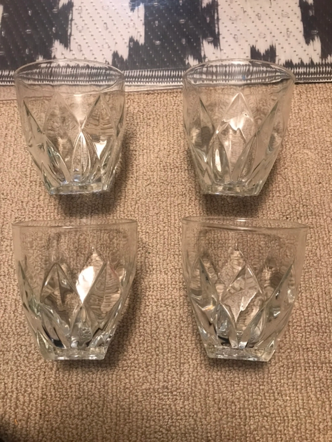 Four clear glass tumblers featuring a diamond-cut pattern. 4” tall