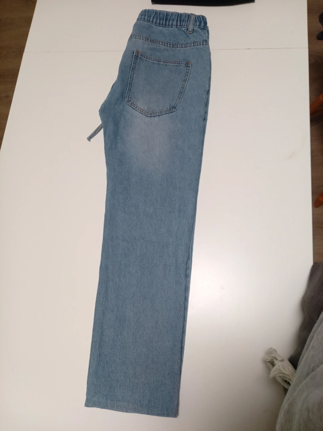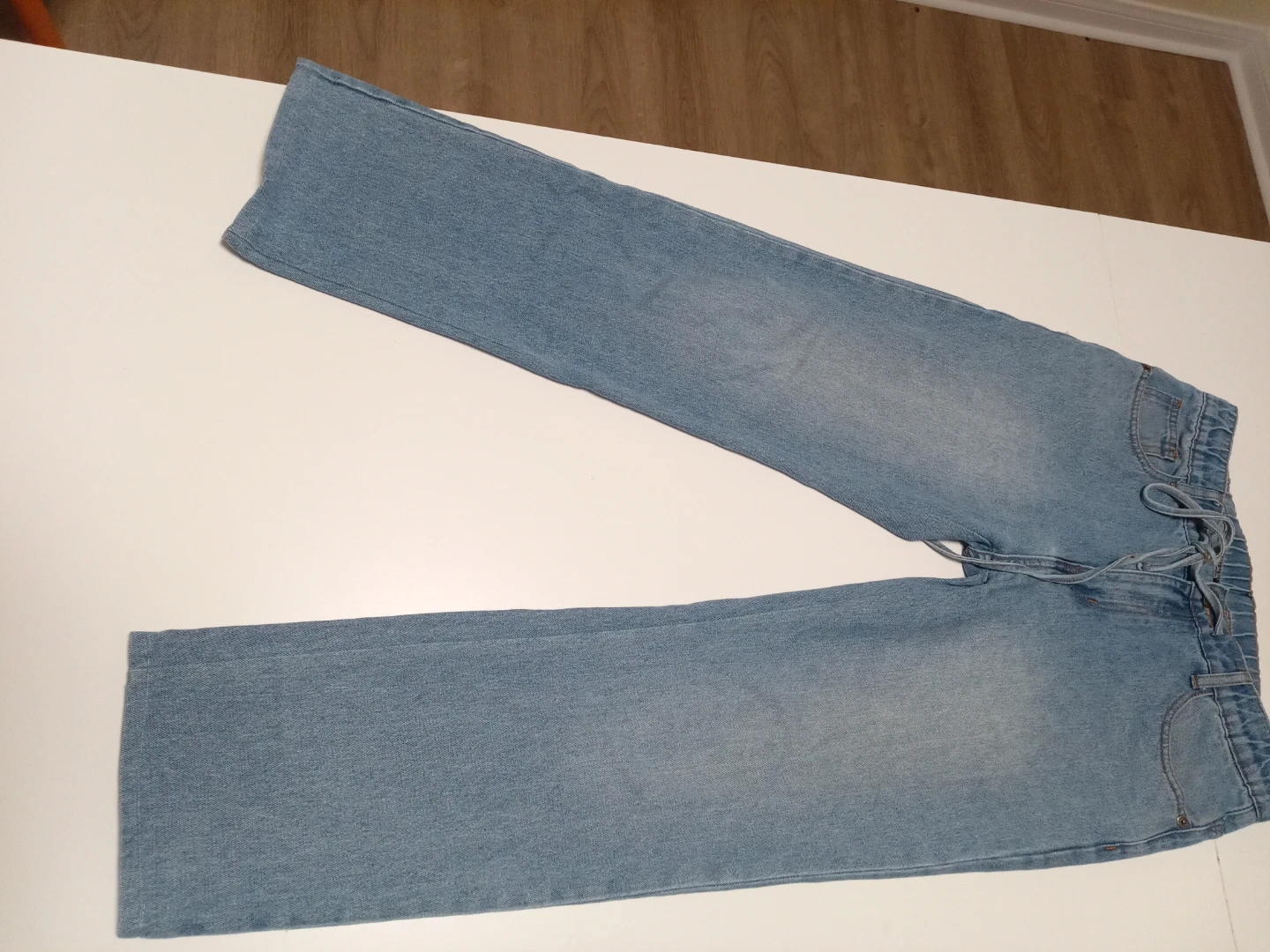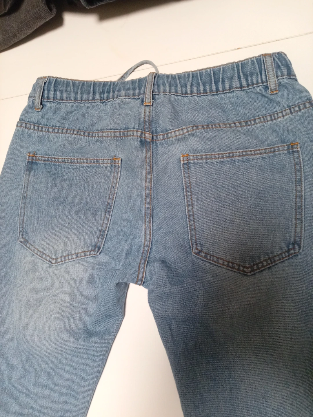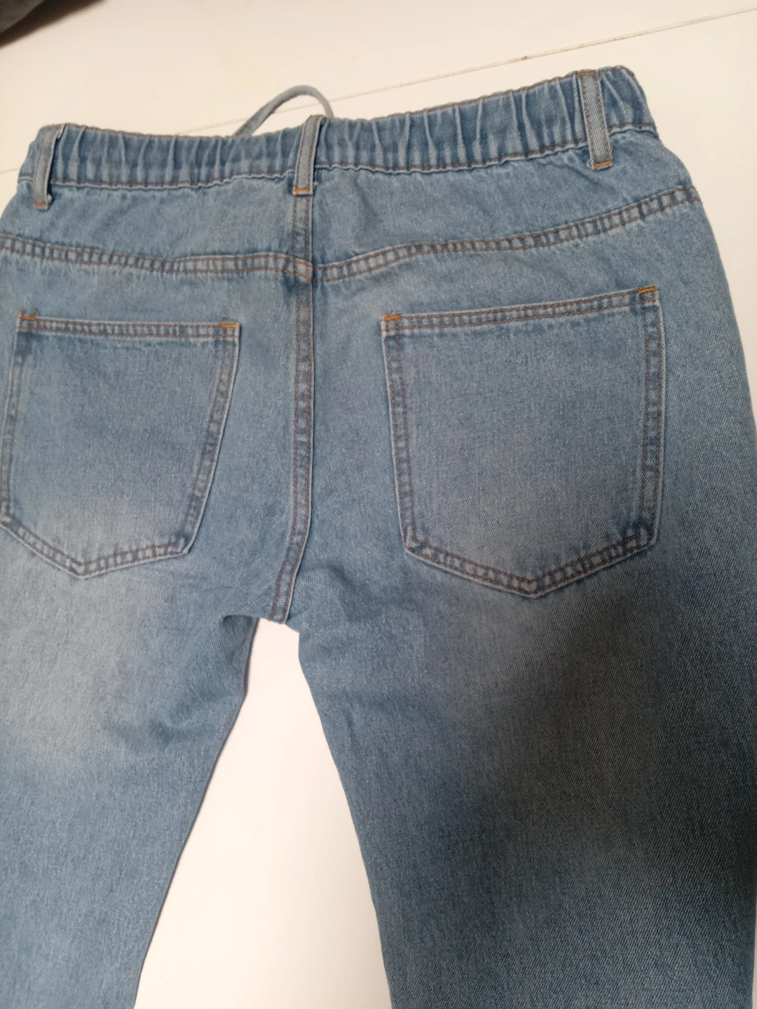 These light wash denim jeans have an elastic waistband with a drawstring. They feature a classic five-pocket design. These are a comfortable casual option for everyday wear.