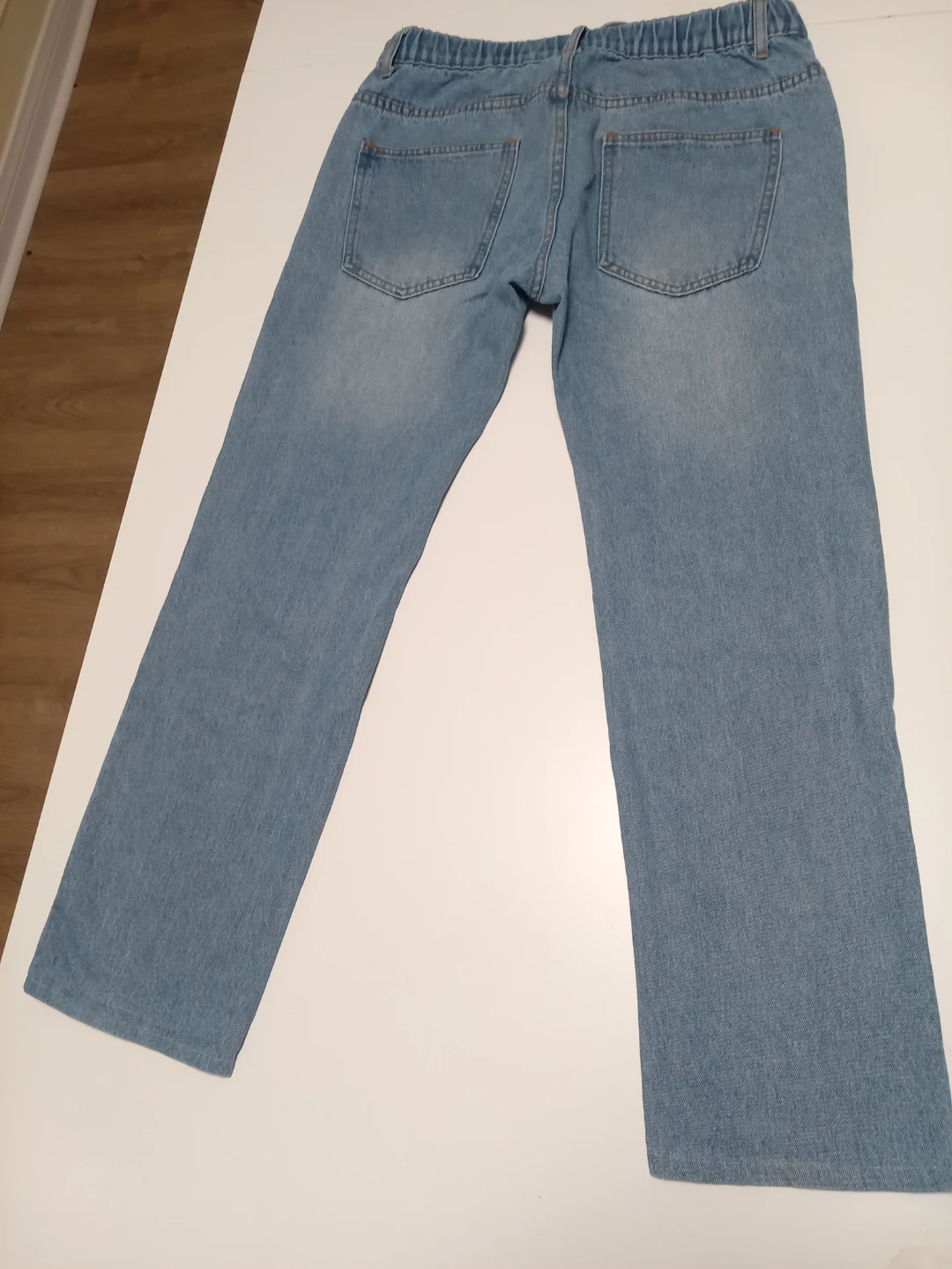 These light wash denim jeans have an elastic waistband with a drawstring. They feature a classic five-pocket design. These are a comfortable casual option for everyday wear.