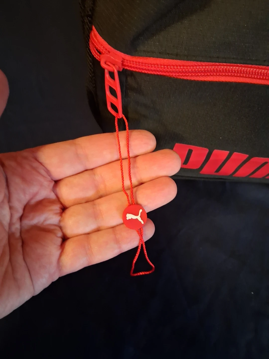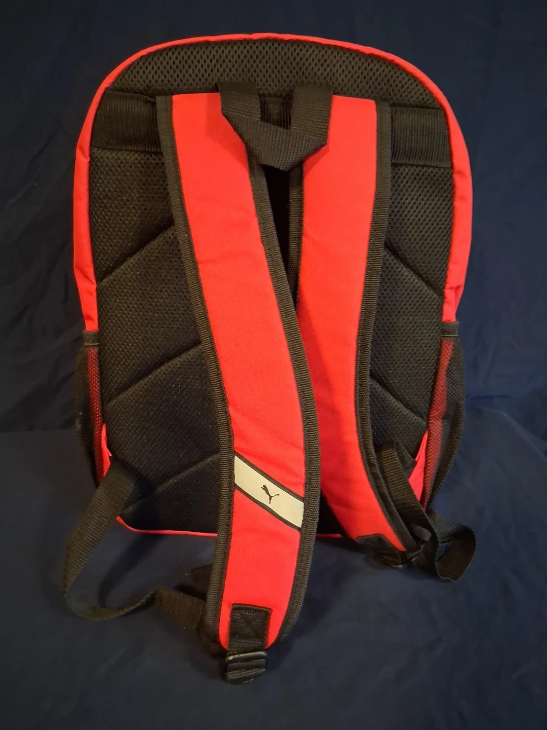 This is a Puma backpack in red and black. It features multiple zippered compartments and side mesh pockets. The padded straps offer comfort for carrying.