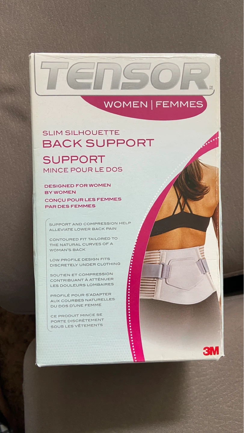 This back support is designed for women and offers slim silhouette support. It's made with contoured fit tailoring for natural curves and provides support and compression to alleviate lower back pain. Its low profile design fits discreetly under clothing.