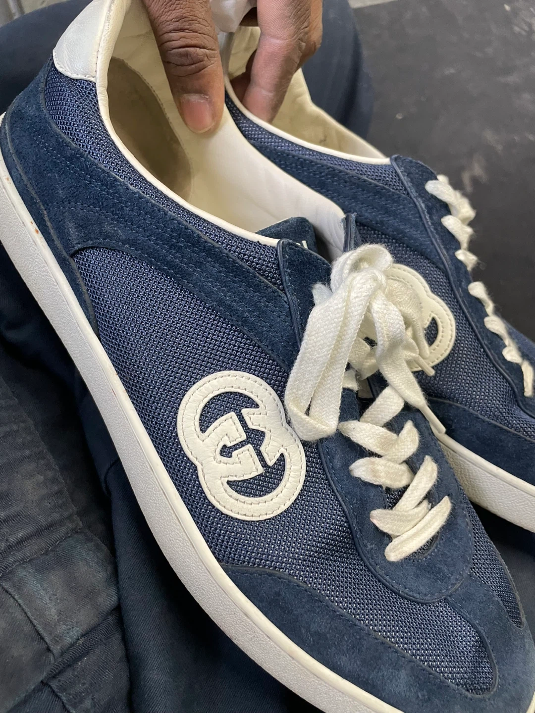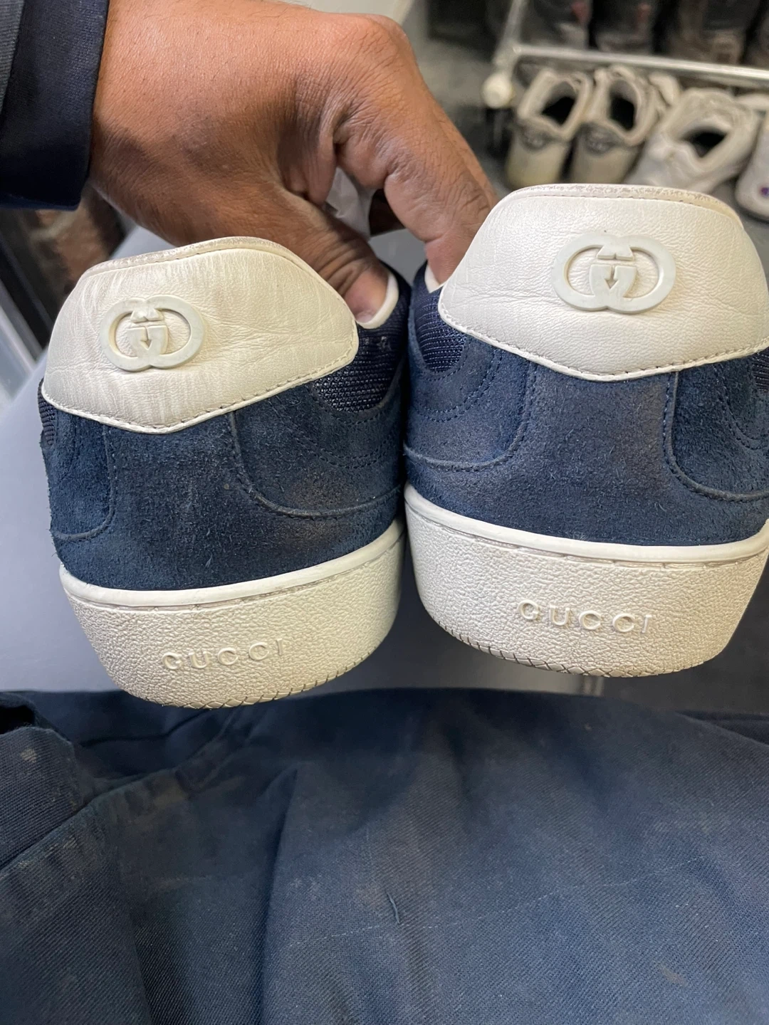 Selling a pair of Gucci sneakers in blue. They are in good condition and feature the iconic Gucci logo on the side and back