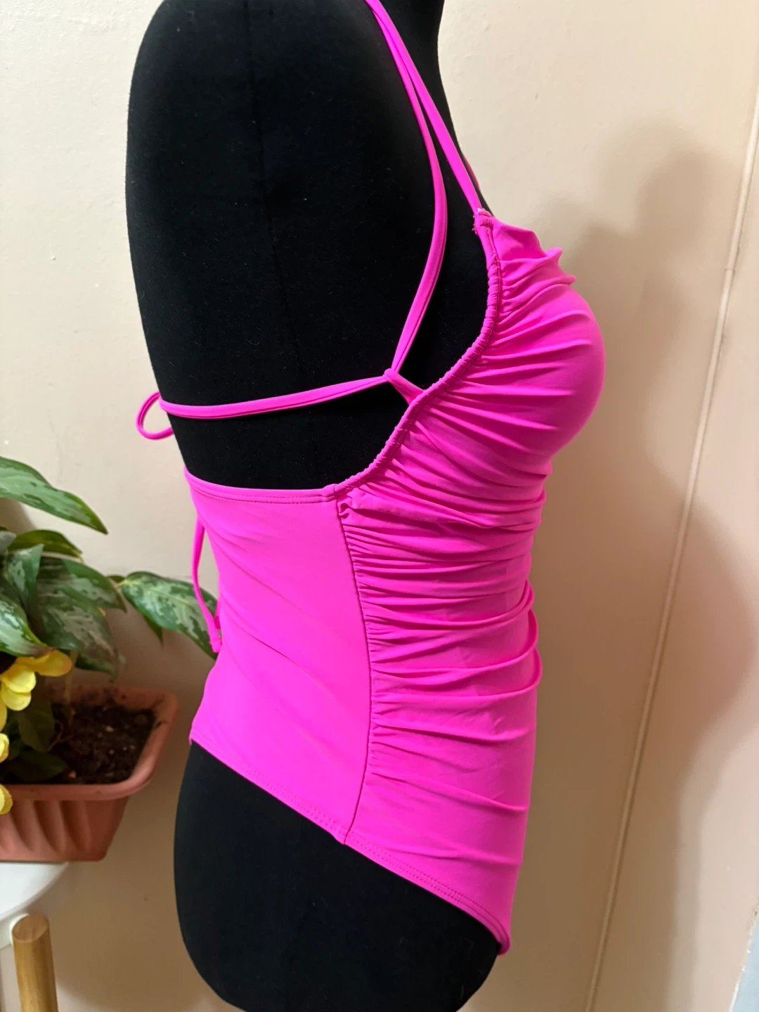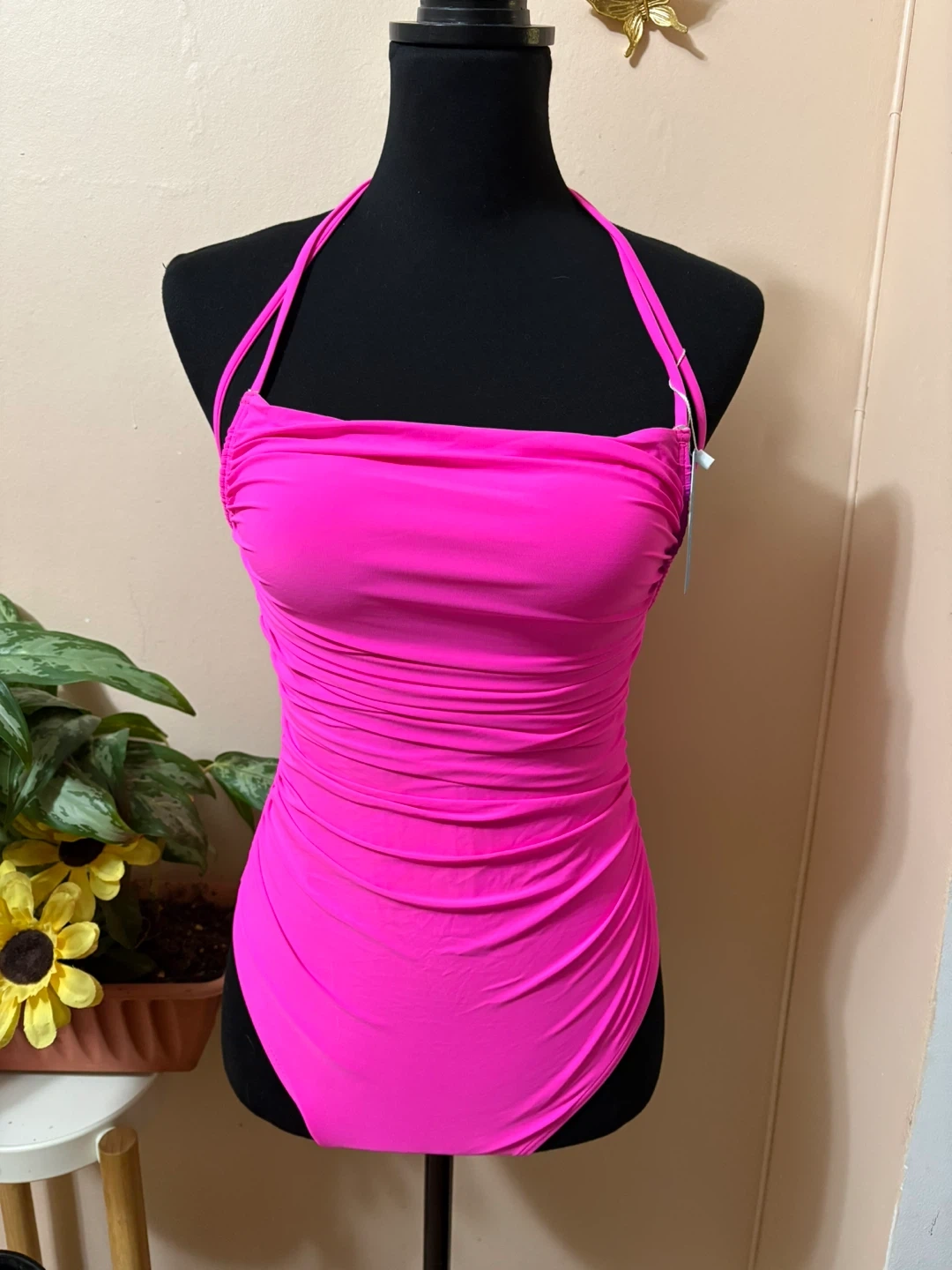 Bright pink Jabeick one-piece swimsuit. Features ruched detailing on the torso and a halter neck tie. Made with 84% polyester and 16% spandex. Size small.