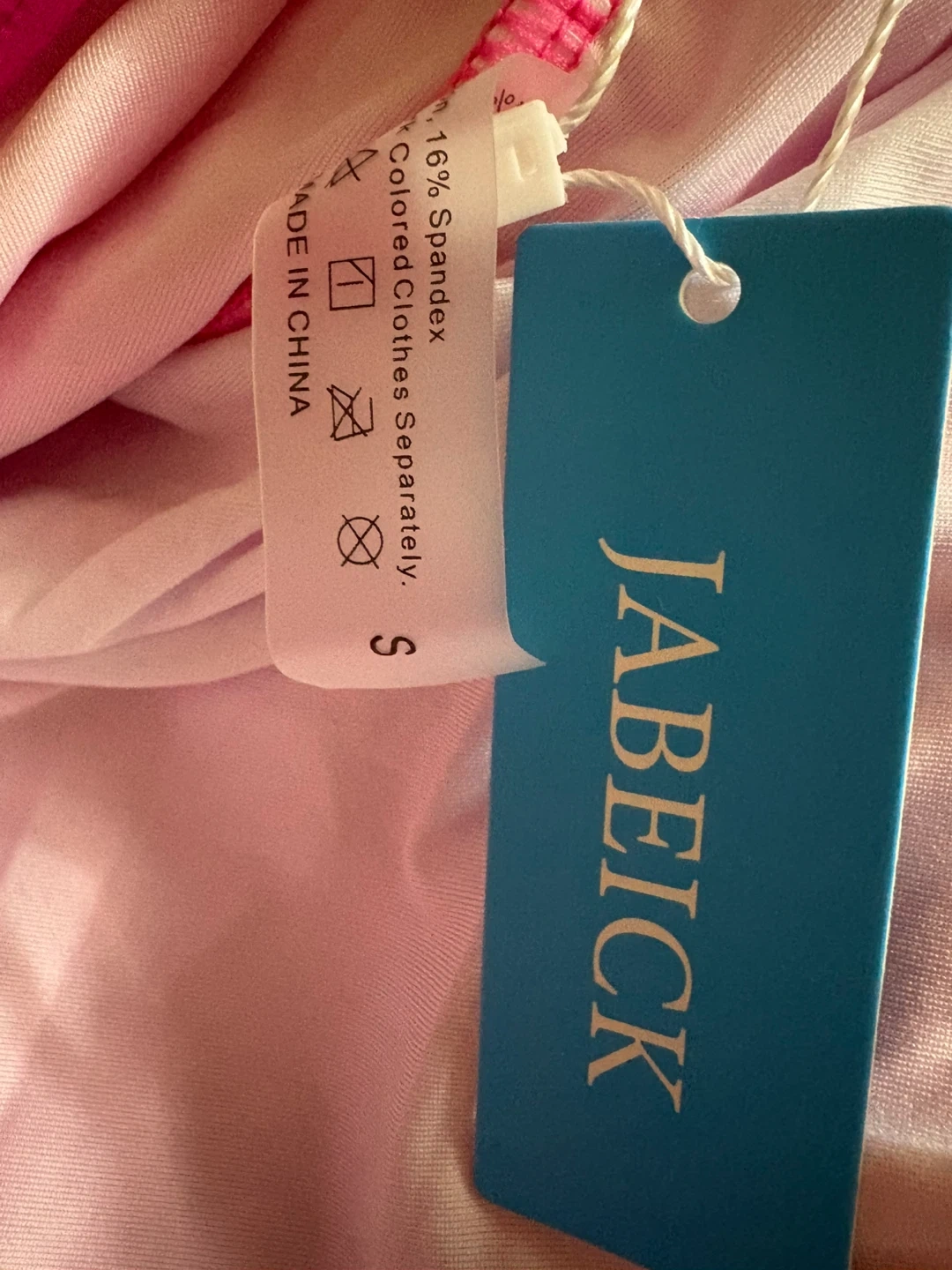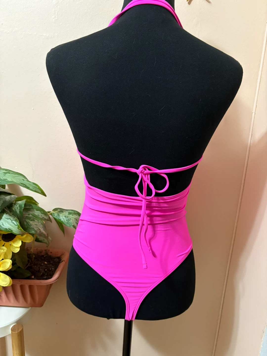 Bright pink Jabeick one-piece swimsuit. Features ruched detailing on the torso and a halter neck tie. Made with 84% polyester and 16% spandex. Size small.