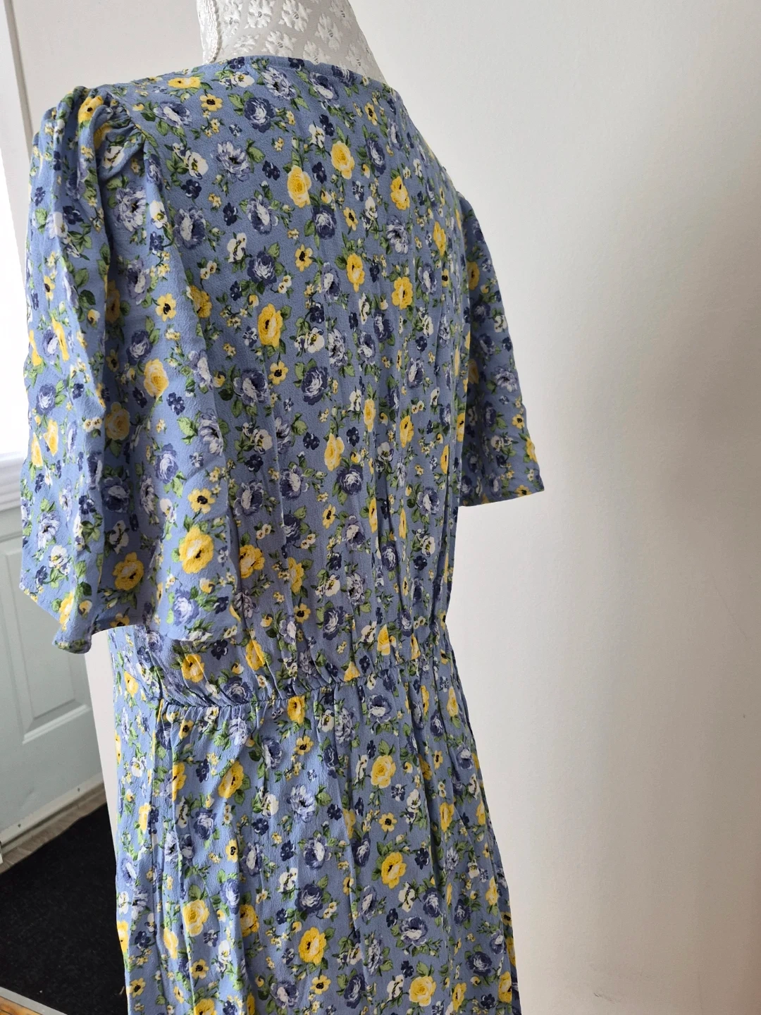 This light blue dress features a cheerful floral print with yellow and purple blossoms. It has short, fluttery sleeves and a shirred neckline. T