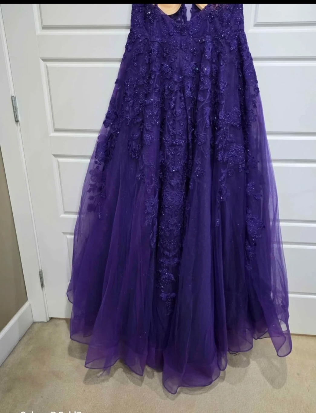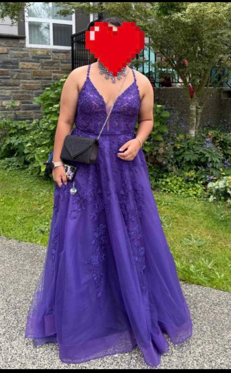 This stunning purple prom dress features intricate beaded lace detailing throughout. It has a flattering V-neckline and a full A-line skirt made of delicate tulle. Perfect for a formal event or graduation!