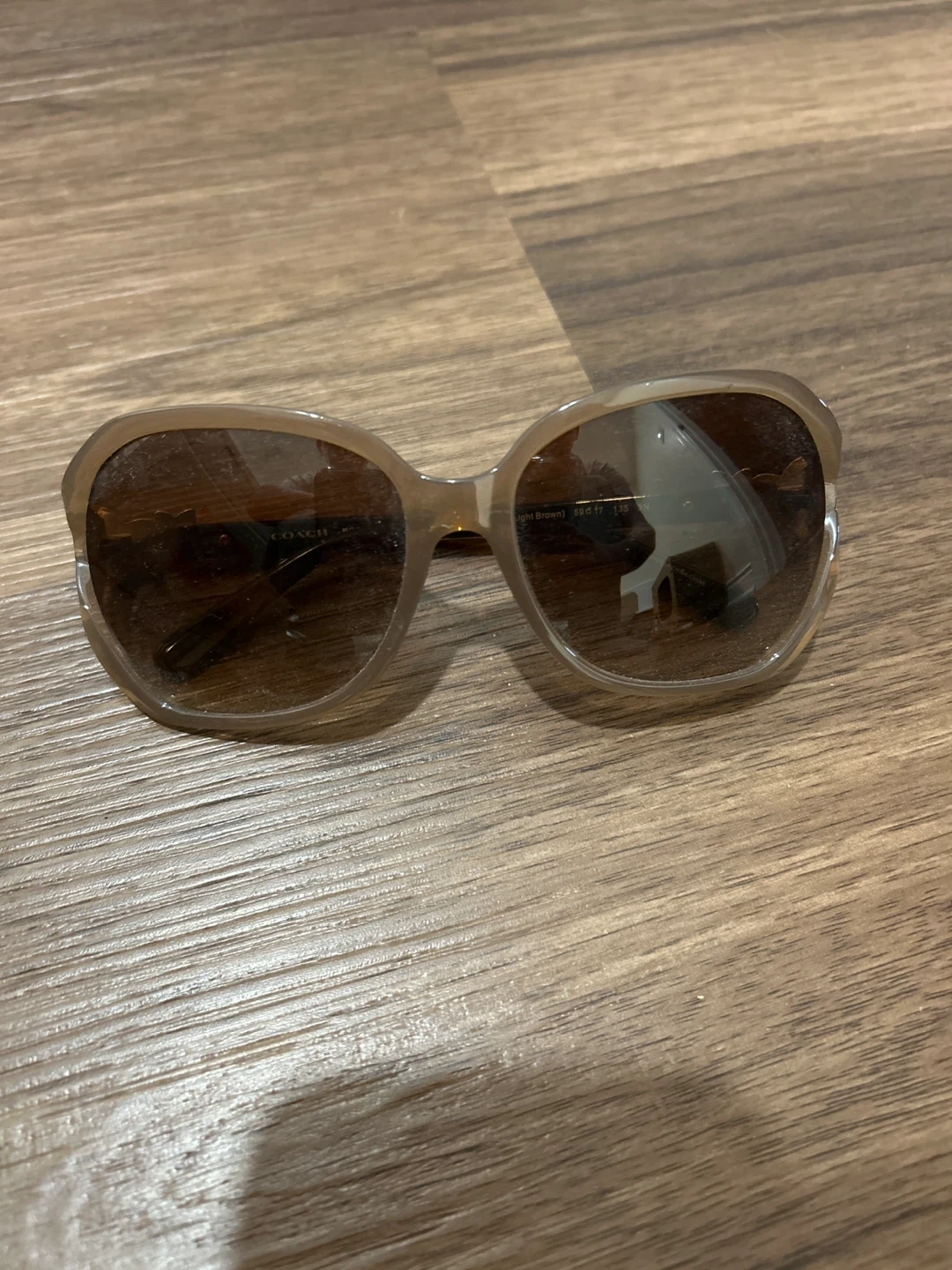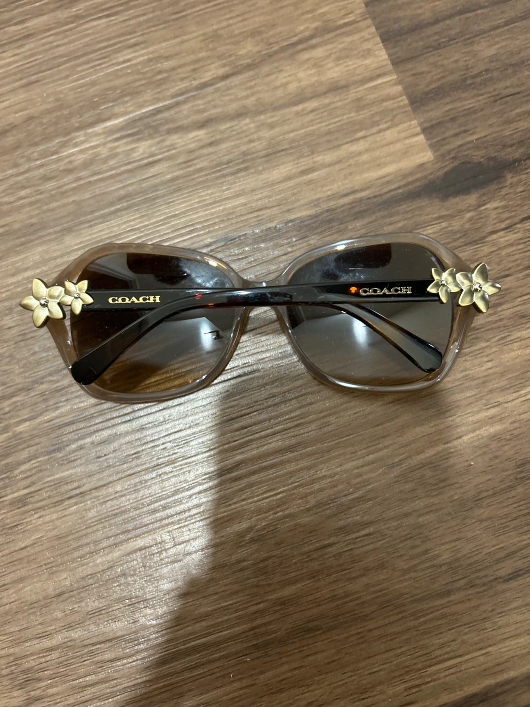 These Coach sunglasses have a stylish brown tortoise shell frame with delicate floral accents. They offer a fashionable look for sunny days. The frame colour is brown.