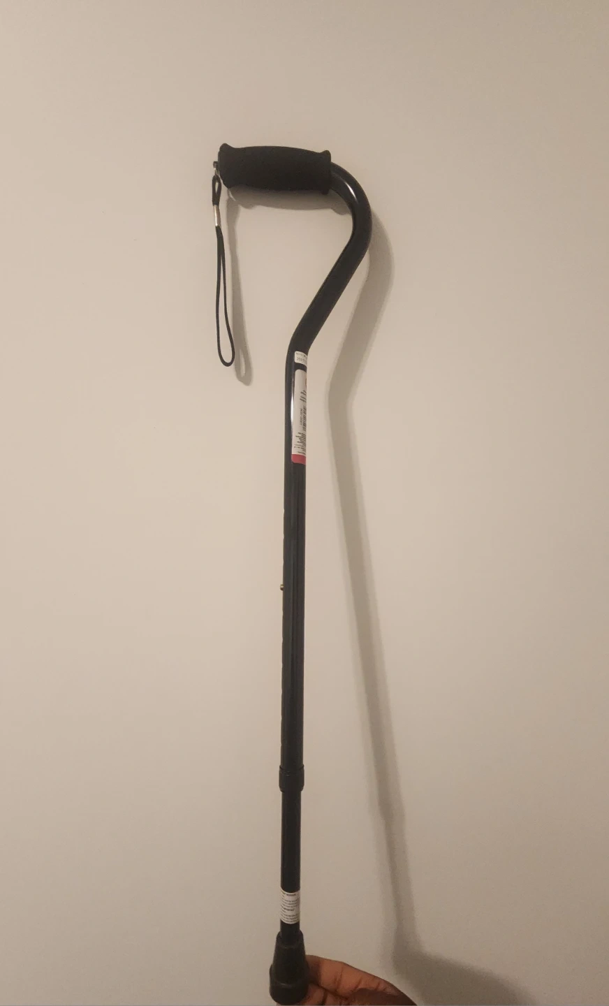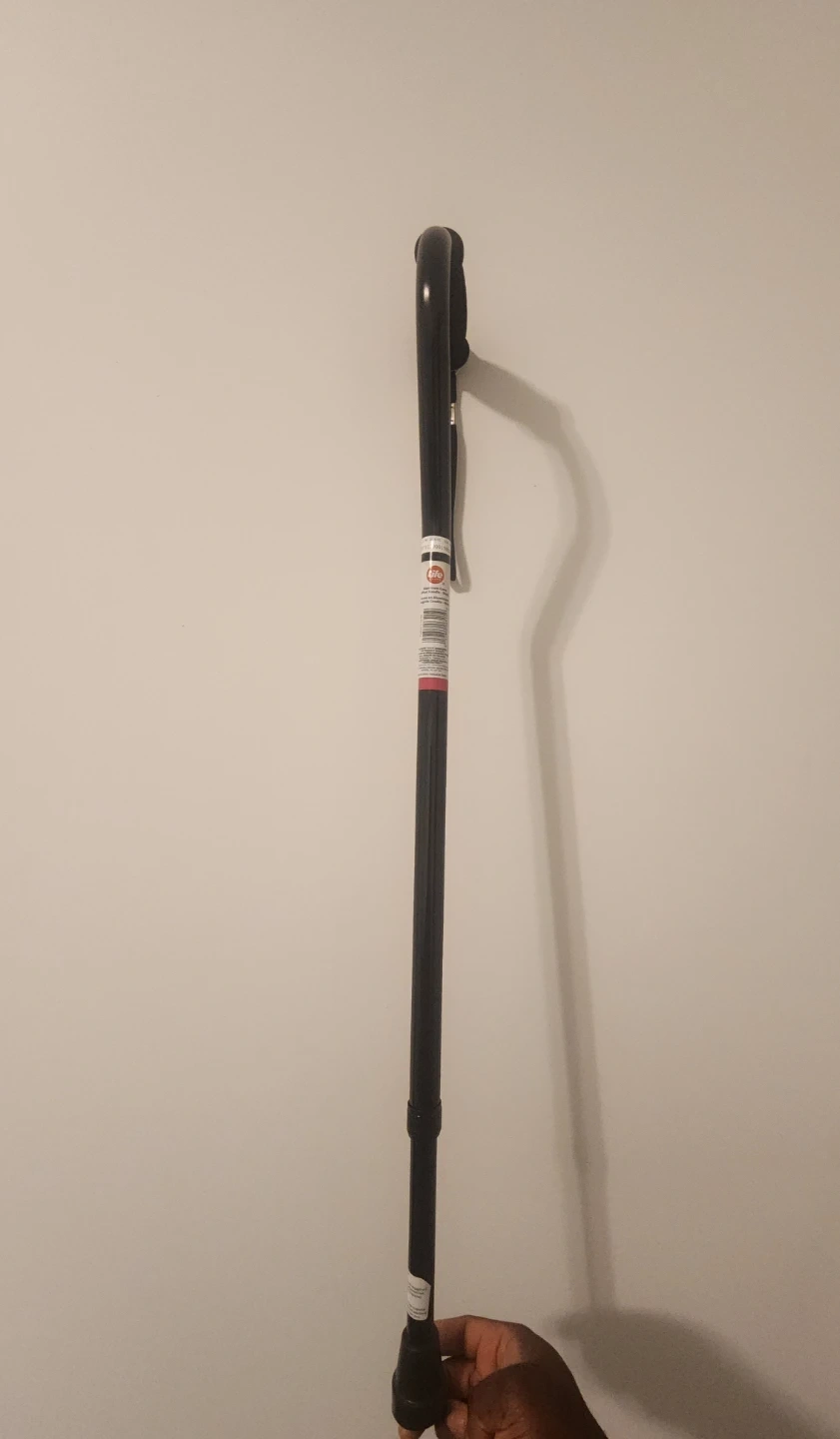 This is a black, adjustable walking cane with an offset handle and a wrist strap. It's designed for stability and comfort. The cane is height adjustable to suit your needs.