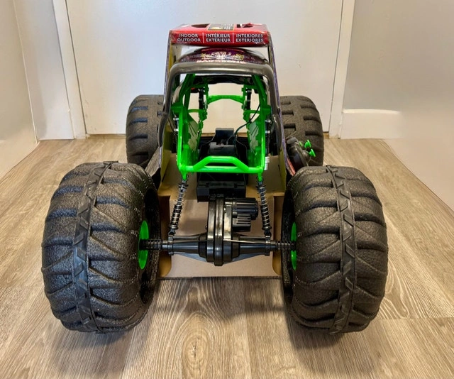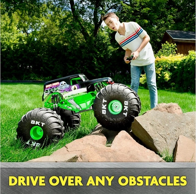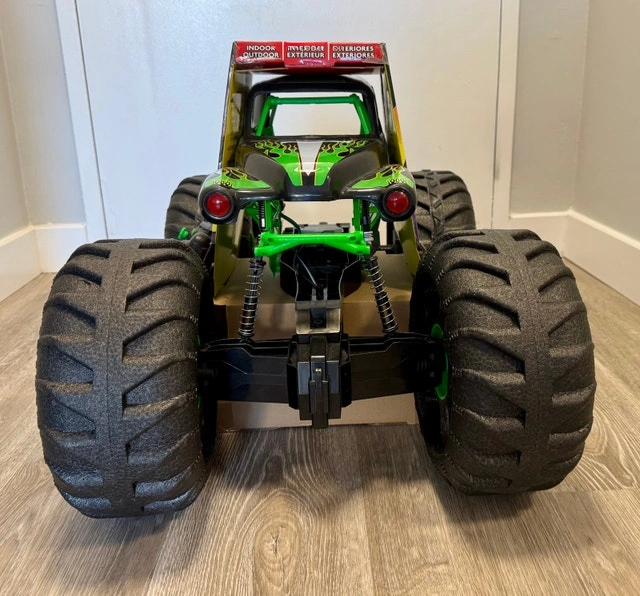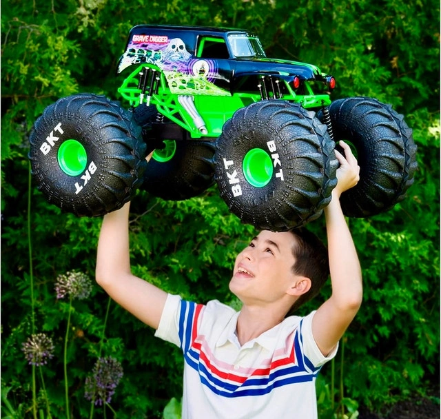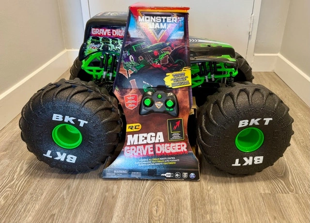 This is the BIGGEST RC Grave Digger ever, over 2-feet long! It's larger, faster, and more powerful than other Grave Digger RCs. You can control it from up to 250 feet away with the dual joystick controller and drive it in any direction. It's designed to drive over any obstacle, on or off-road, thanks to its lightweight design and huge tires. With rubber treads, mega-sized shocks, and suspension, this RC monster truck can tackle anything. It's an official Grave Digger replica with authentic graphics, oversized BKT Tires, and working lights. It features a built-in USB charging cable. This is a top gift for kids aged 4 and up. Requires 2 AAA batteries for the remote control (not included). Let me know if you're interested!