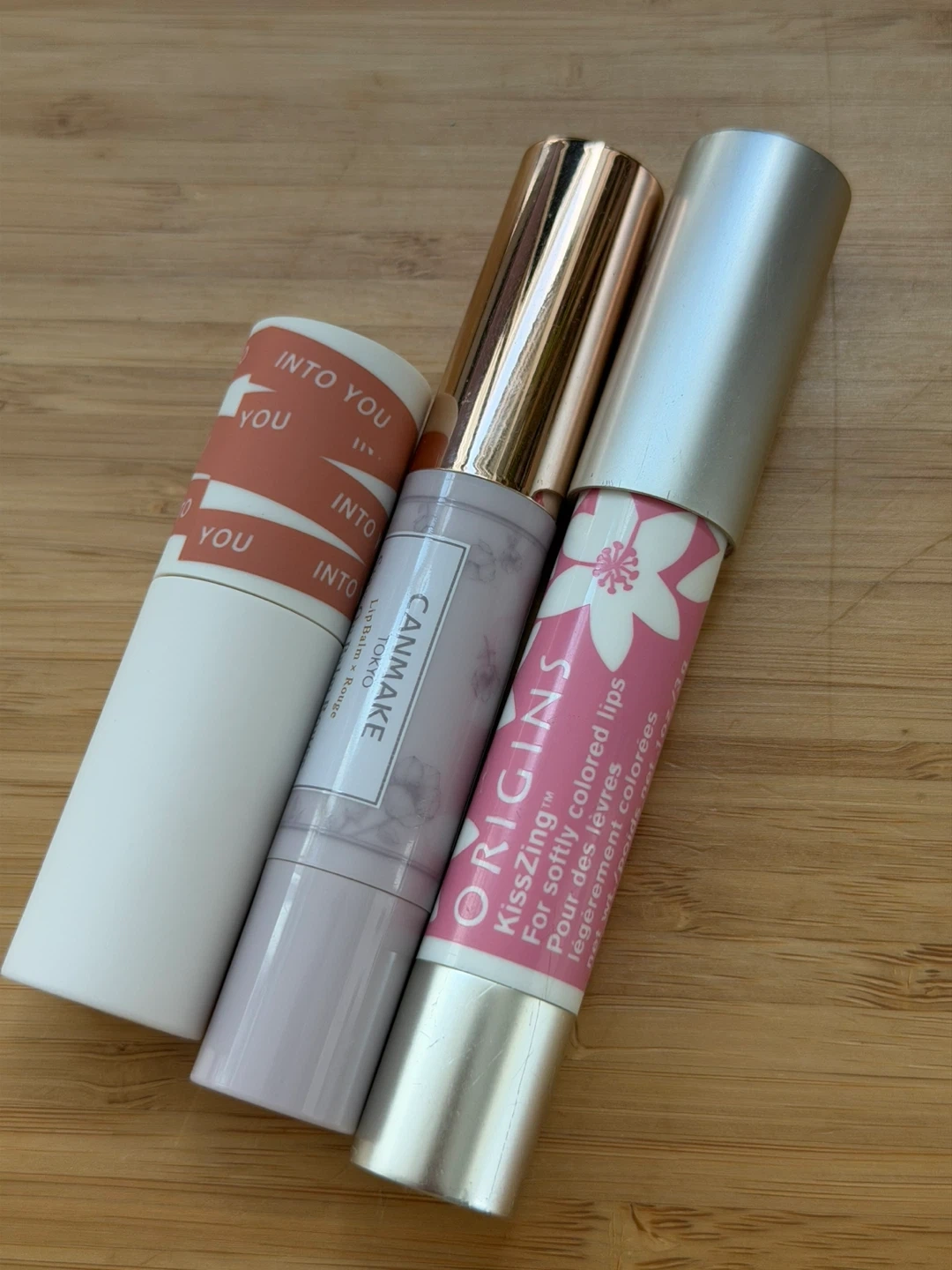 Three lipsticks from Canmake and Origins. Includes one Canmake lipstick and one Origins Kissing lipstick and one Intoyou lipstick.