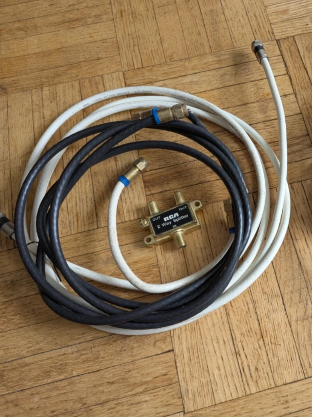RCA 2-way splitter included with two coaxial cables. One cable is white and the other is black. Perfect for splitting an antenna or cable TV signal.