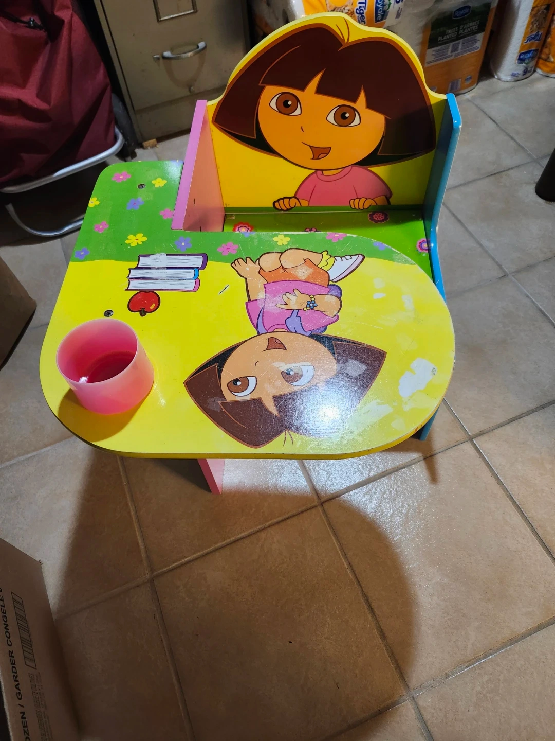 Dora desk the sit opens but you need to hold it and you can store things.