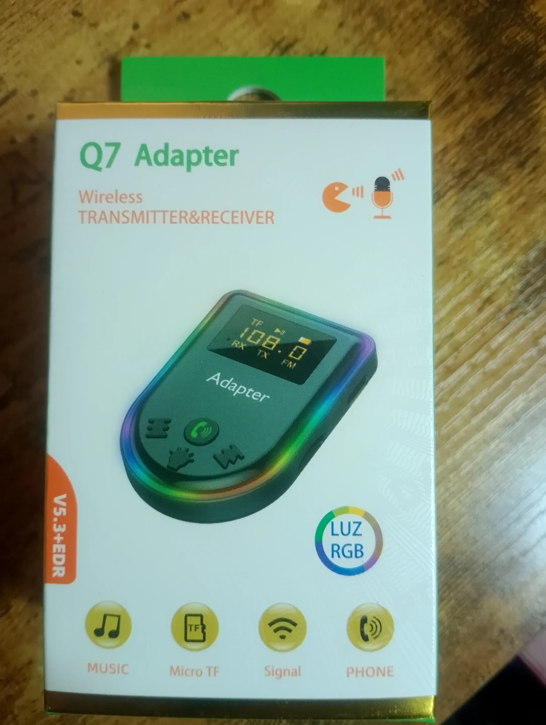 This Q7 adapter functions as a wireless transmitter and receiver. It supports music playback, Micro TF card input, signal transmission, and phone calls. It also offers RGB lighting and a visual operating interface.
