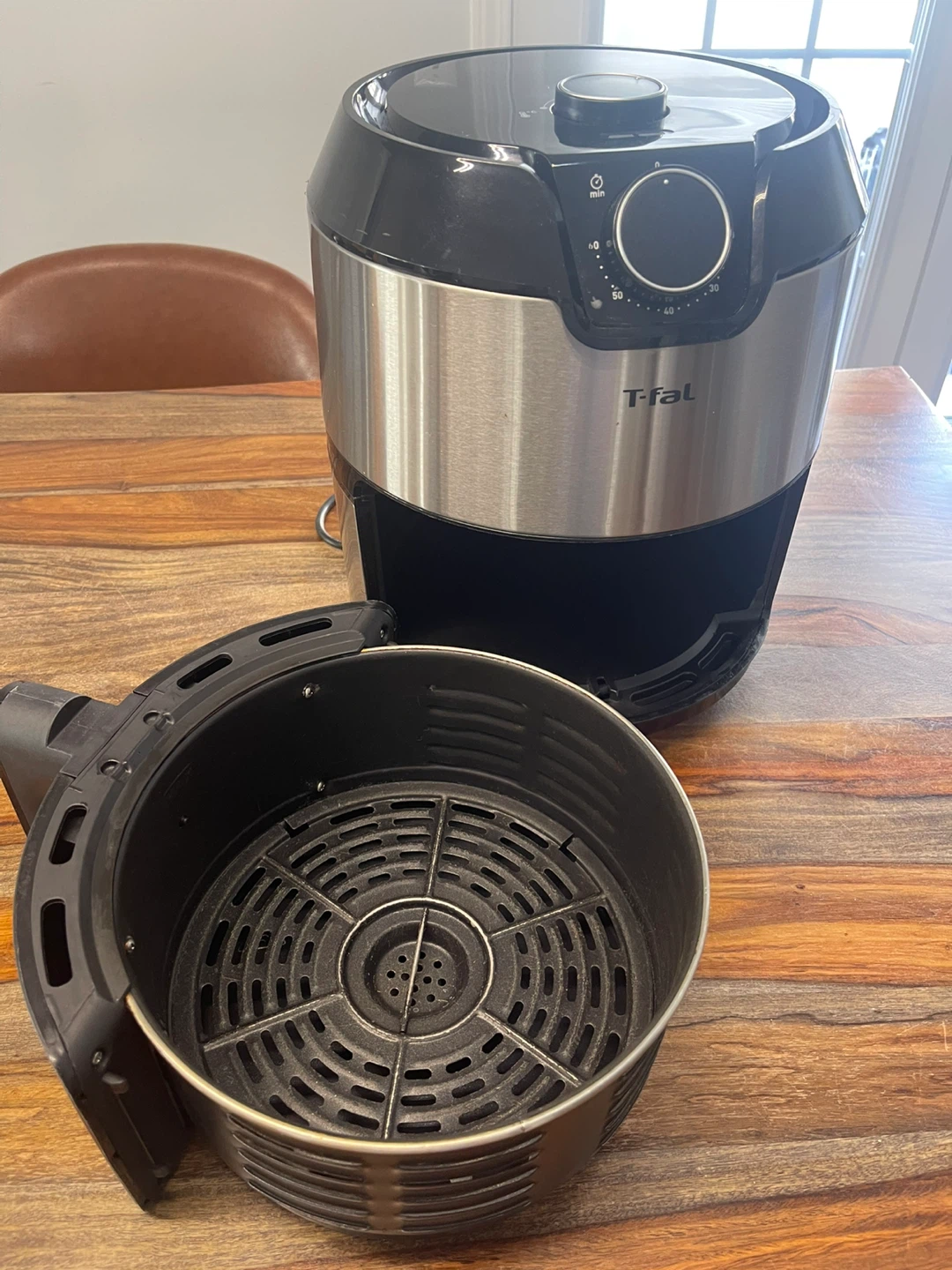This is a T-fal air fryer with a removable basket and crisping plate. It features a timer dial with settings up to 60 minutes. It's made with stainless steel and black plastic.