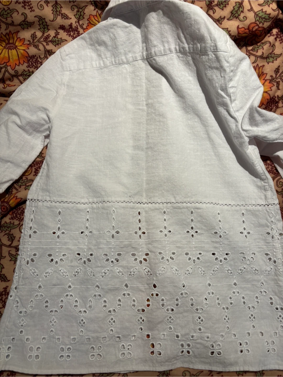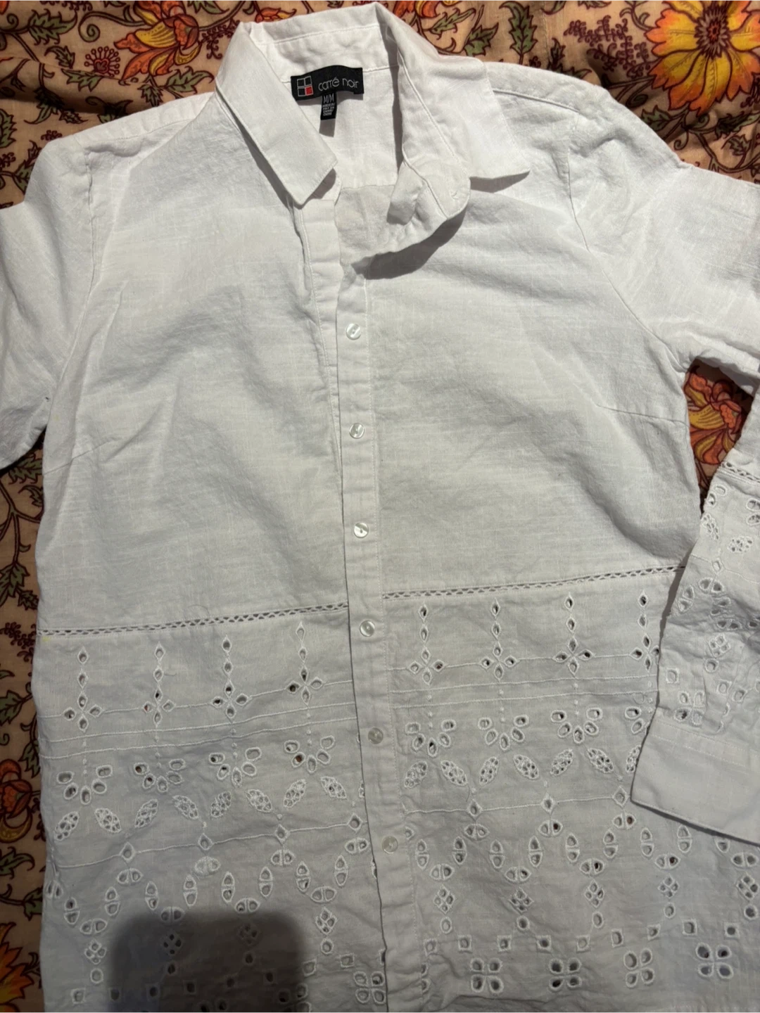 Women's white button-up shirt from Cotton Day. Features lovely eyelet detailing on the hem and sleeves. It's made from a breathable cotton blend, perfect for warmer weather. This classic shirt is versatile for casual or dressy occasions.