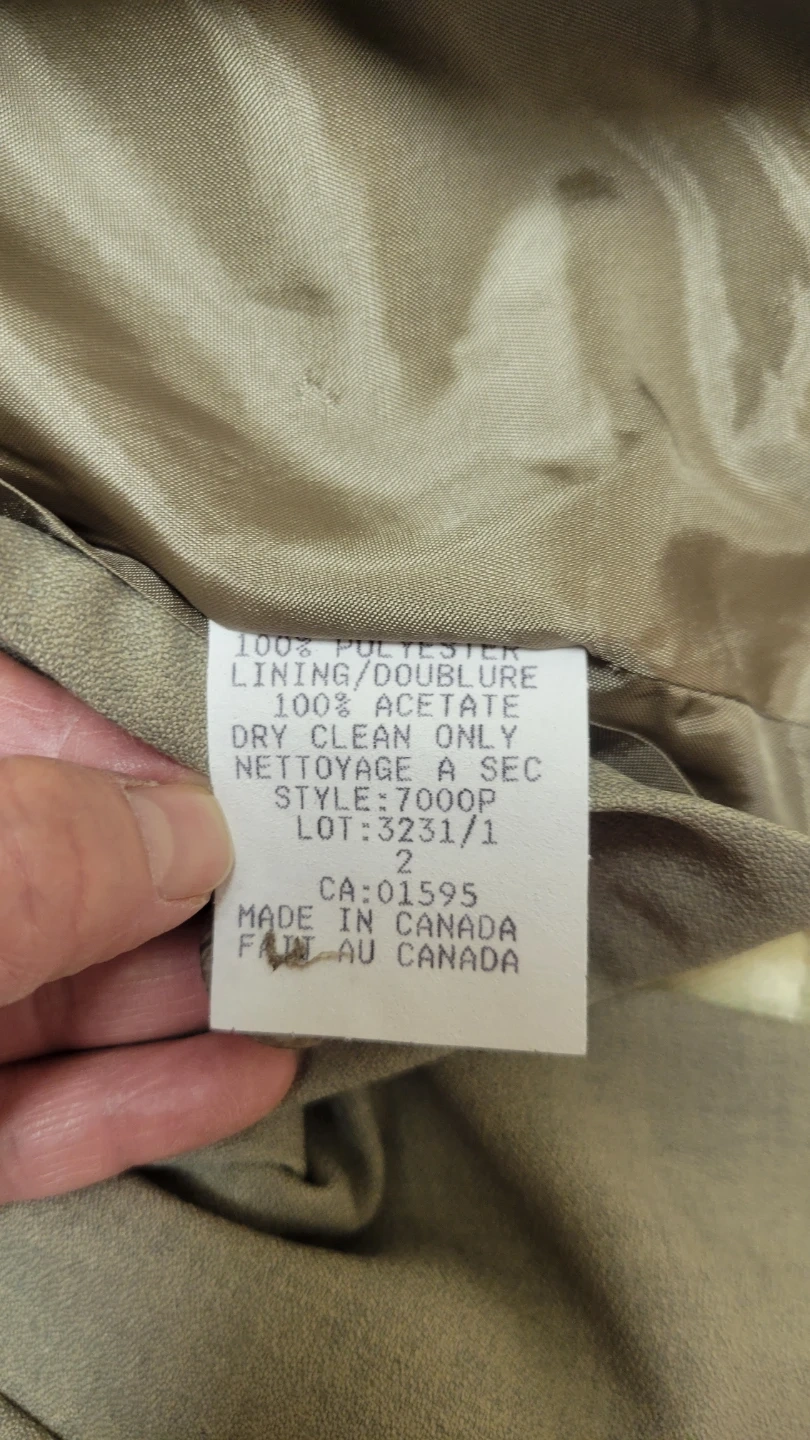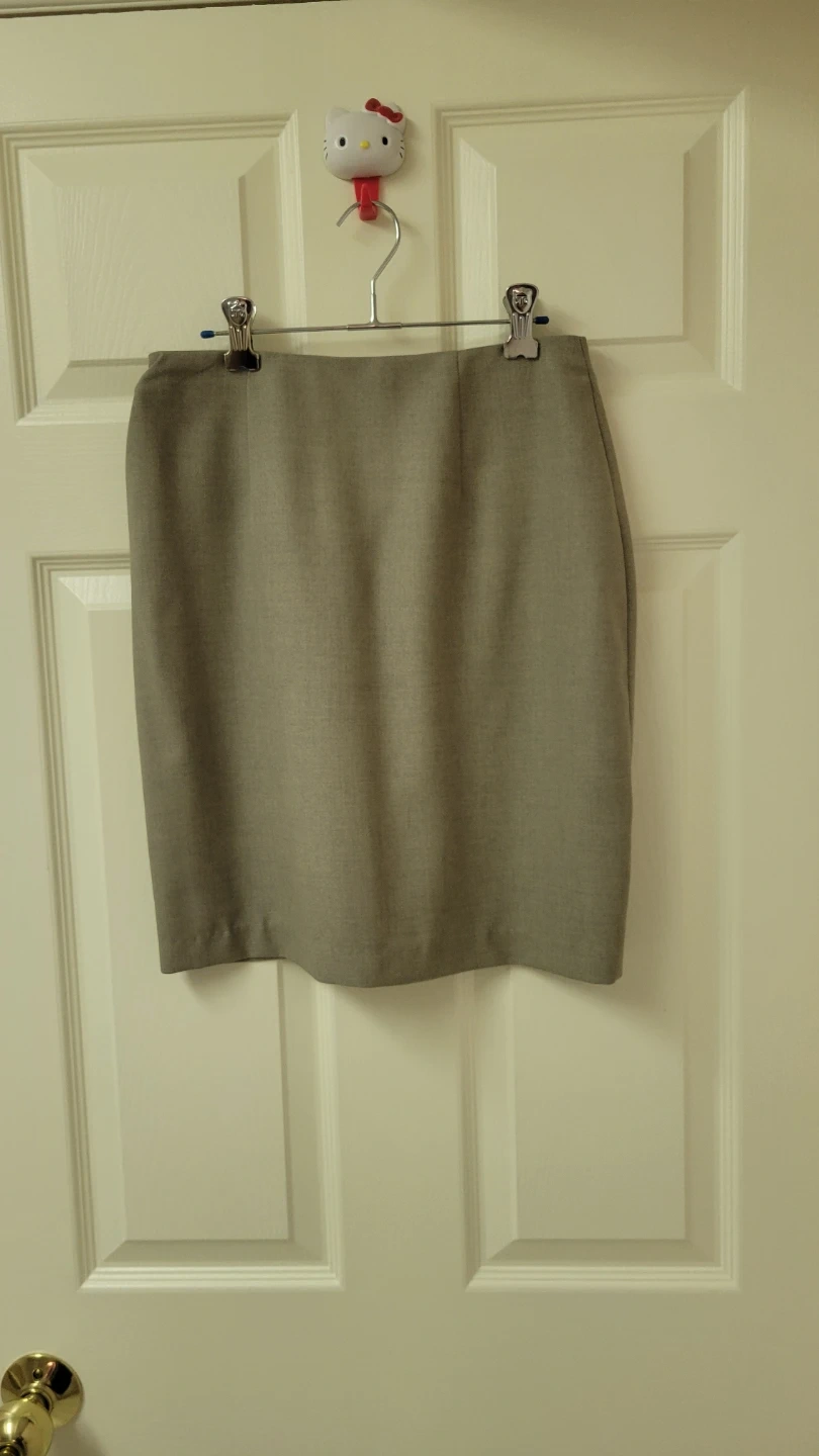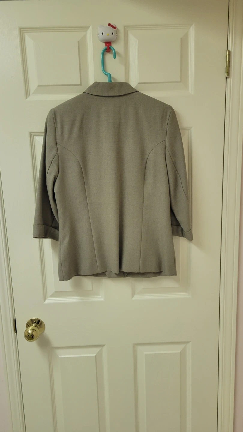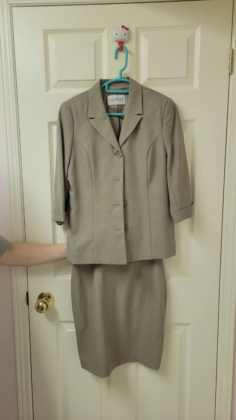 This matching suit set includes a tailored blazer and a pencil skirt. Both pieces are made from a polyester and acetate blend. Blazer has three-button closure and cuffed sleeves.