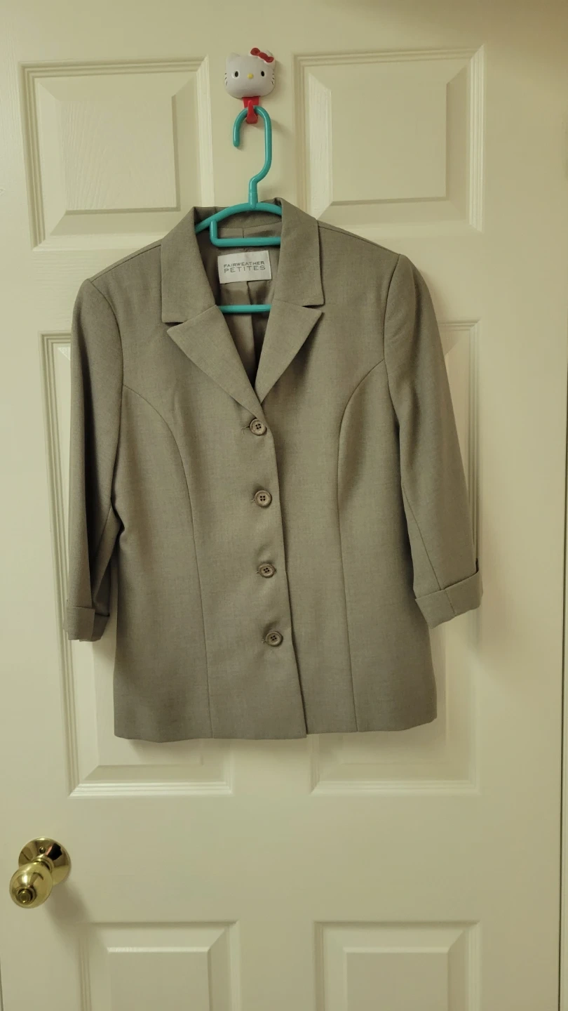 This matching suit set includes a tailored blazer and a pencil skirt. Both pieces are made from a polyester and acetate blend. Blazer has three-button closure and cuffed sleeves.