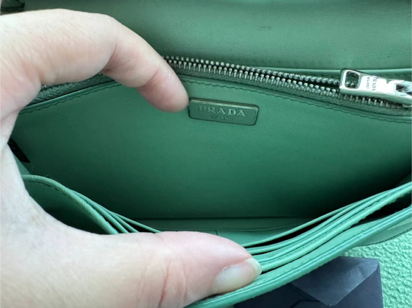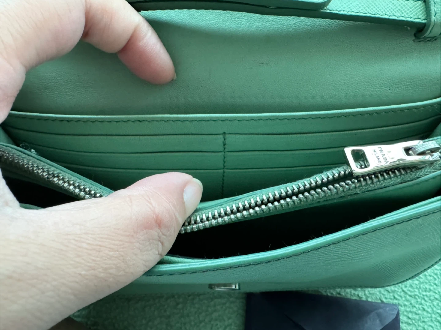 100% AUTHENTIC Gorgeous Prada WOC with removable strap allowing you to carry it as a clutch! One long zipper pocket on the inside with 4 total compartments. 12 card slots (6 on each side). Easily fits cell, keys!